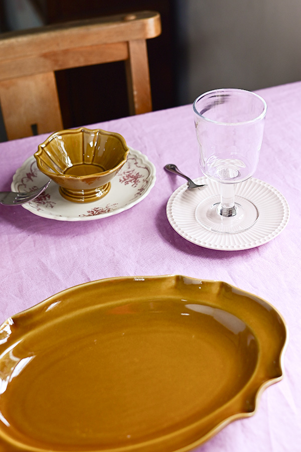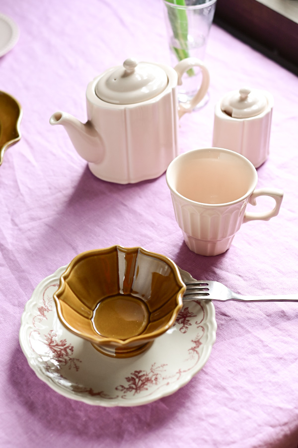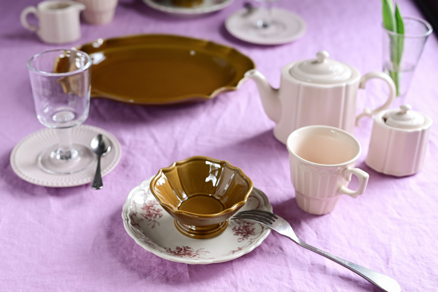 柔らかなピンクのクロスと温かみのある飴色の器が、春の訪れを感じさせるコーディネート。 ピンクは華やかで優雅な印象を飴色は落ち着きと温かみをもたらし、組み合わせることで大人っぽく品のある雰囲気を演出します。 春らしい爽やかな器使いの中で温もりある飴色の器がアクセントとなり、テーブル全体を引き締めてくれる効果もあります。 春を待ちわびる今の時期にもぴったりな組み合わせです。