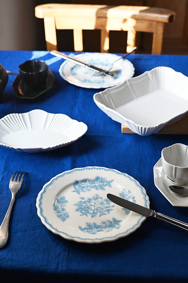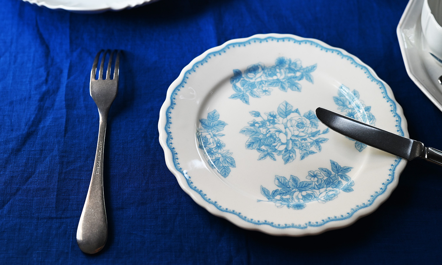 柄の器や細かな装飾の器と、鮮やかなブルーのクロスを合わせ、洗練された高貴な雰囲気のコーディネート。 磁器素材ならではのシャープな装飾を施した器は、凛とした雰囲気を演出します。