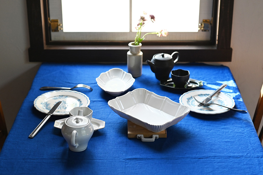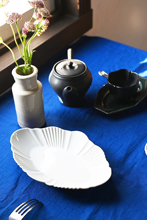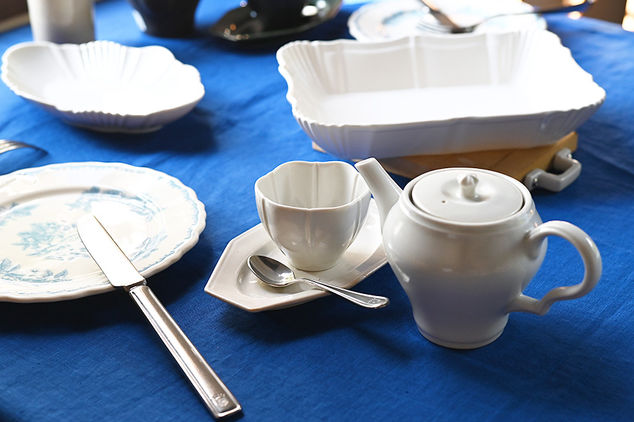 比較的薄手な磁器素材の器は、さらりとした軽やかな風合いのクロスによく似合います。単調になってしまわないようにと取り入れたのが、柄の器と紺や黒の器。柄はアクセントに、濃い色の器はテーブル全体を引き締めてくれる効果があります。