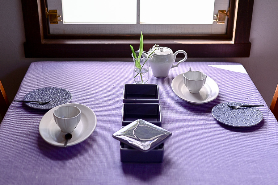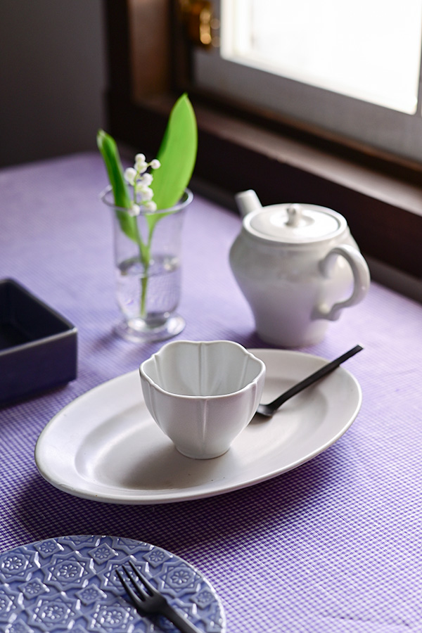 装飾が際立つ艶のある器に、シンプルな白のマットな質感の器を組み合わせることで全体のコーディネートに抜け感と軽やかさを加えます。濃淡のある紫のトーンを重たく見せず、清潔感と上品さを感じさせるポイントです。