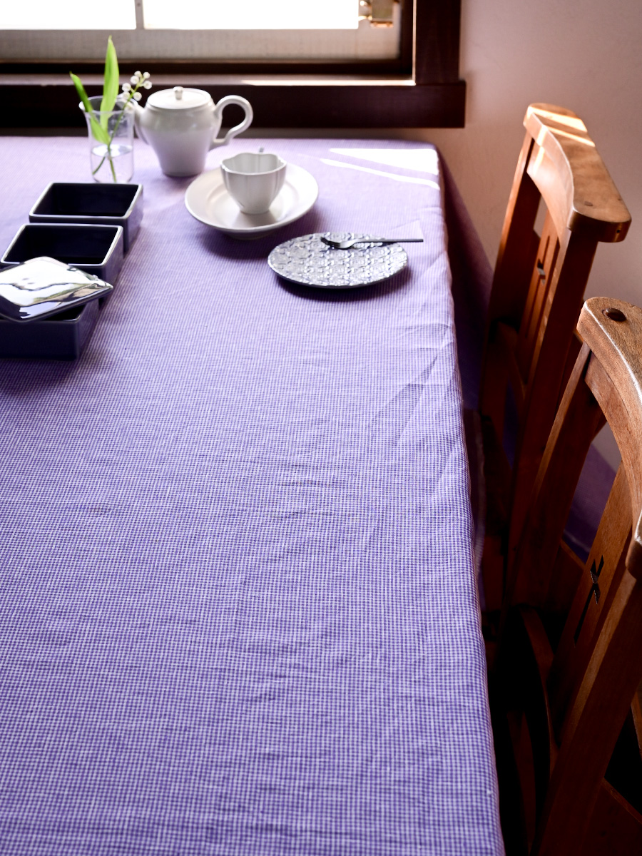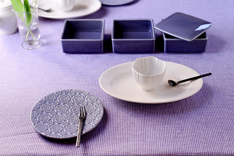 ラベンダーのクロスと器を使ったコーディネート。クロスのギンガムチェックに加えて、器はラウンド、オーバル、スクエア、花形といった多様な形状を取り入れることで、視覚的にリズムと変化を生み出しています。器のフォルムにバリエーションがありながらも、色味は統一することで全体にまとまりがでます。