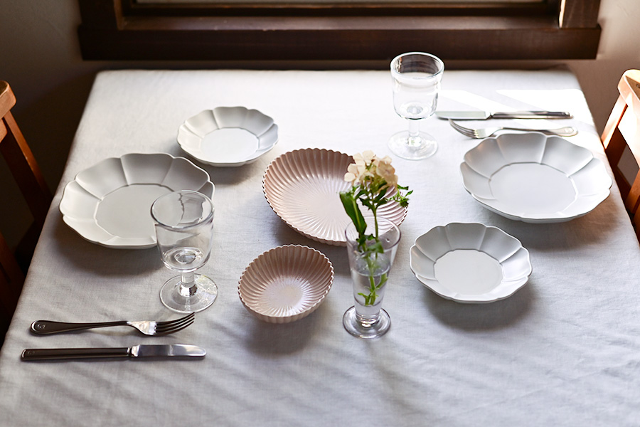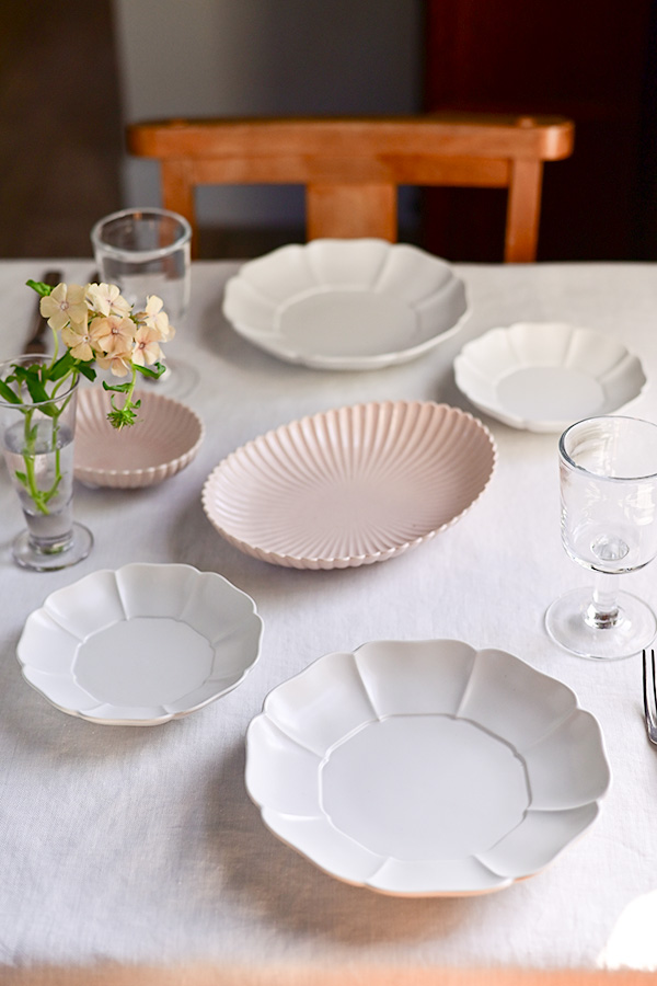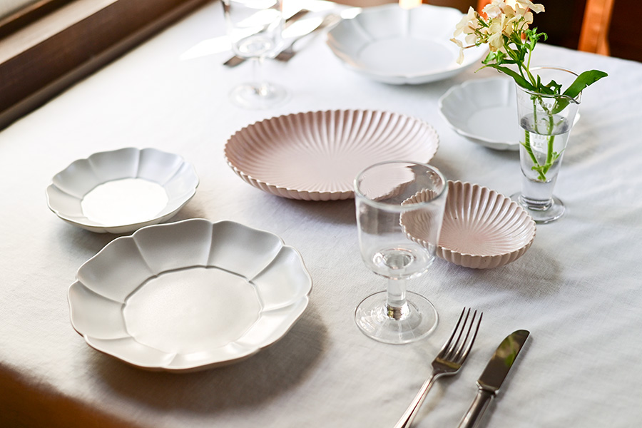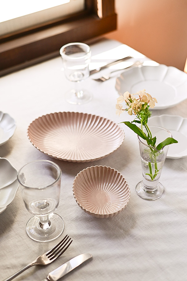 白いクロスがテーブル全体をすっきりとまとめ、器一つひとつの美しいシルエットを際立たせる、洗練されたコーディネート。清らかな白を基調とする中に、淡いピンクの器をそっと添えることで、やわらかな温かみとリズムが生まれ、優しさを感じる食卓に仕上がります。