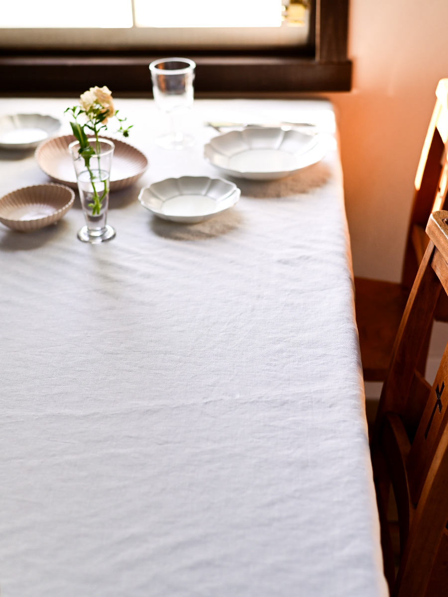 白いクロスは、器に落ちる影までも引き立て、光と影が織りなす陰影がテーブルに立体感を生み出します。立ち上がりのあるフォルムの器を取り入れることで、シンプルながらも奥行きと表情のあるテーブルに。 視覚的にも満足感のあるコーディネートをつくることができます。