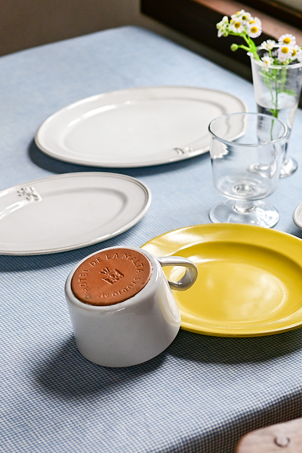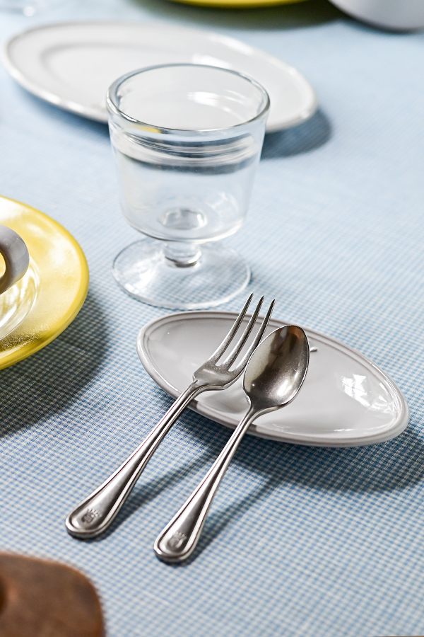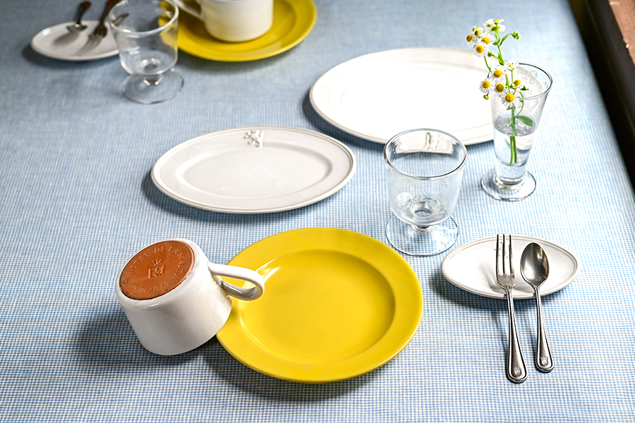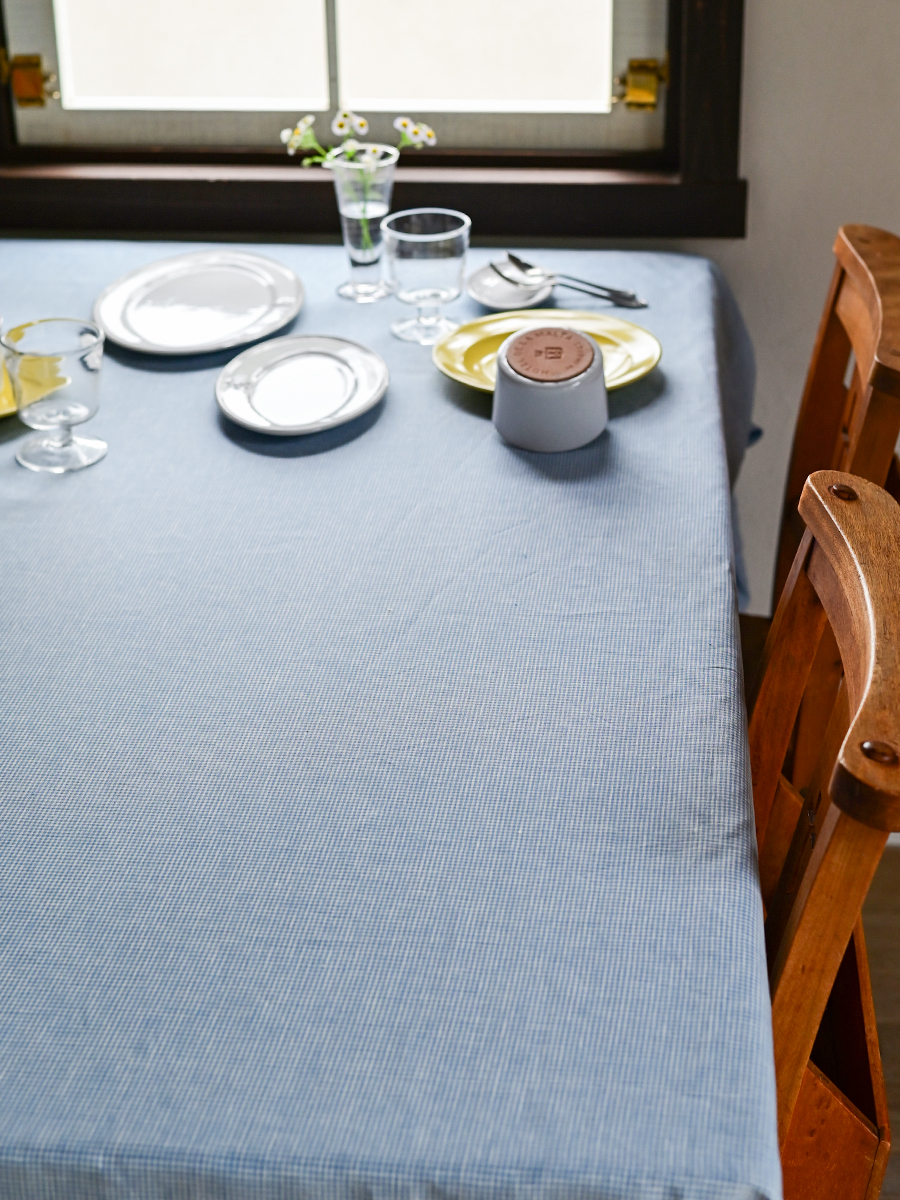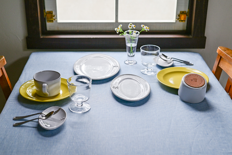 水色のクロスと黄色の器を組み合わせた、爽やかなコーディネート。 水色のクロスが涼しげな印象を与え、ビビッドな黄色を差し色にすることで、テーブルを明るくポップに見せてくれます。 補色に近い関係の2色を合わせることで、お互いの色を引き立て合う効果もあります。