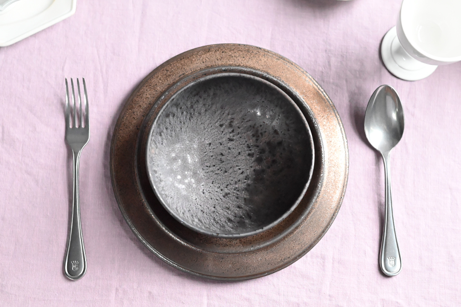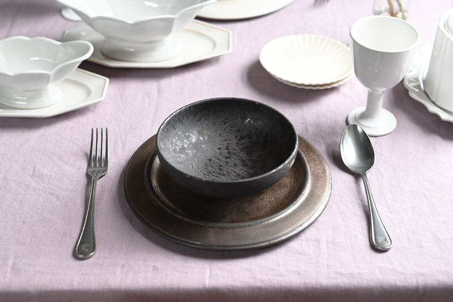 赤みのあるブロンズや金結晶の器はパープルとの相性が良く、 コーディネートに取り入れる事でテーブル全体が引き締まります。