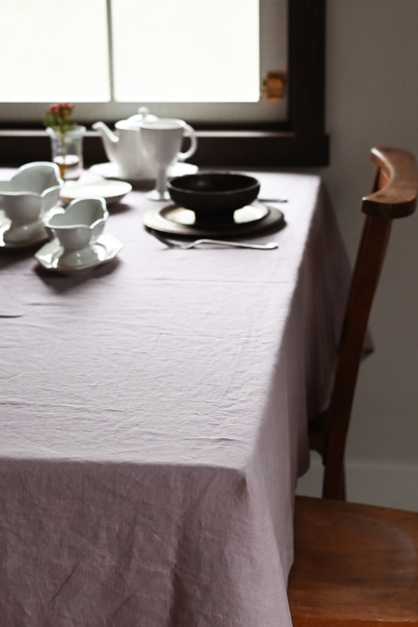 可愛らしさと落ち着きを併せ持つラベンダーのテーブルクロスに白の器を合わせたコーディネート。灰みを帯びたラベンダーの色味は、器の素材感やニュアンスカラーの柔らかさを引き立てます。