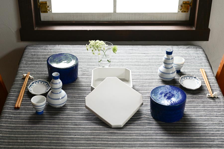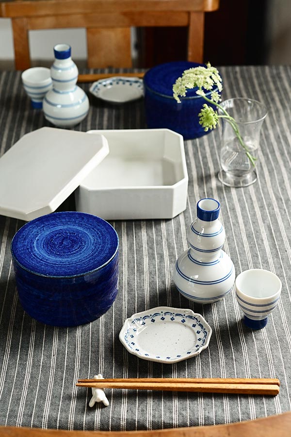 深みのあるグレーのクロスに、特別感のある器を組み合わせたおもてなしの食卓です。 お重や酒器、高台皿など印象的な器を取り入れながらも、白と青を基調にまとめることで、上品でフォーマルな雰囲気を演出しています。 器はそれぞれに個性がありますが、色を揃えることで統一感が生まれ、濃いグレーのクロスの上で一層引き立ちます。