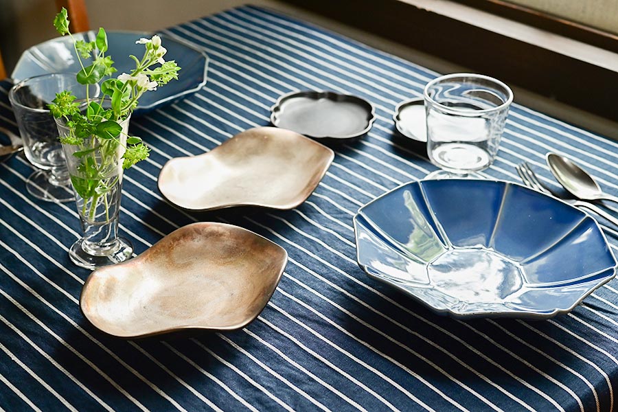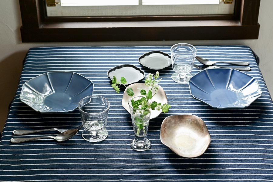 銀彩の器や曲線的なフォルムの器を組み合わせることで食卓にリズムが生まれます。また、ガラスと陶器という異なる素材を合わせることで、質感に変化が加わり、単調にならず奥行きのある雰囲気に仕上がります。ガラスの透明感が抜け感を演出し、陶器の落ち着きと共存することで爽やかさと上質感を兼ね備えます。