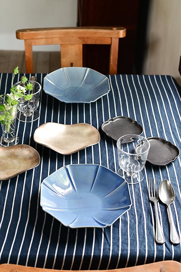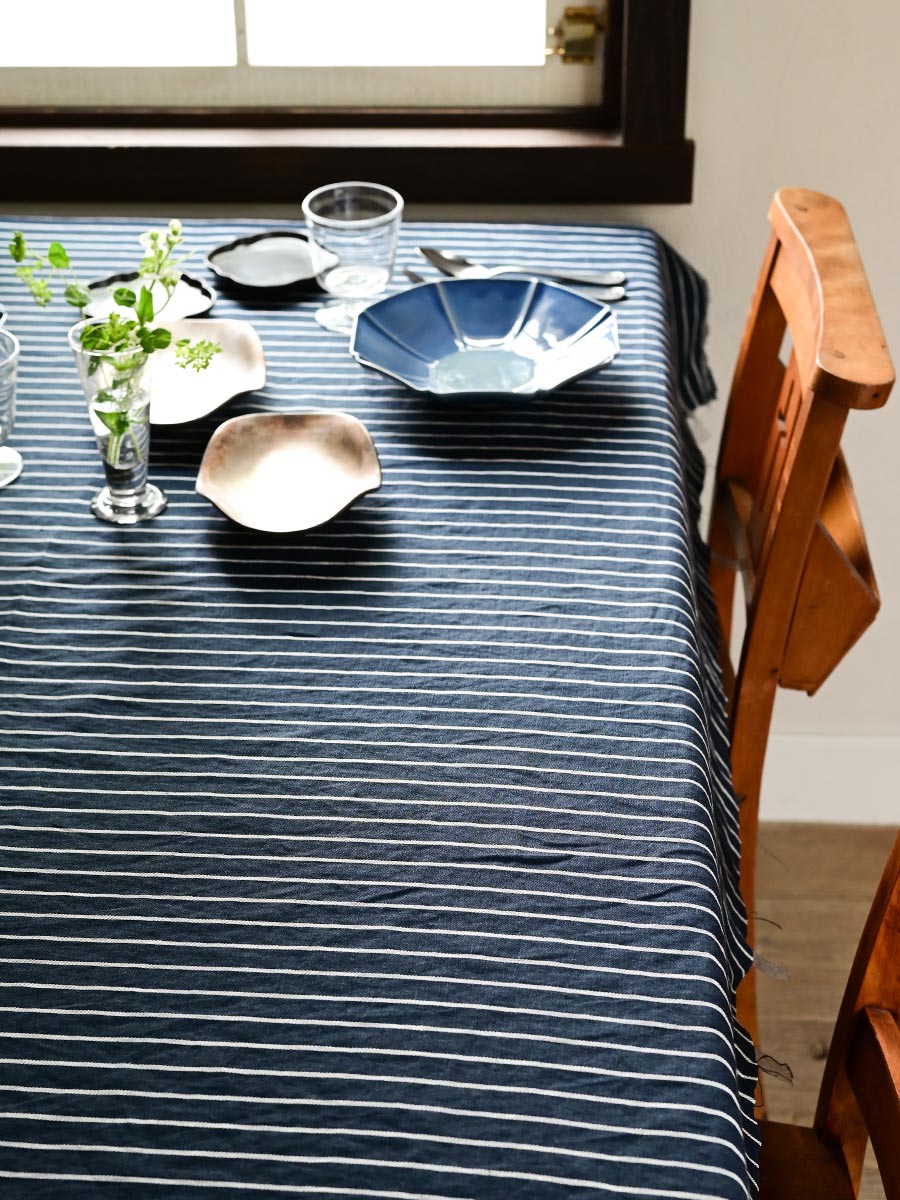 ストライプのクロスにシックな器を合わせた大人のコーディネート。 ストライプ柄はテーブルに奥行きを感じさせ、ゆったりとした印象を与えてくれます。 ネイビーに白のストライプはコントラストがはっきりしており、視線を自然に集めるため、テーブル全体を印象的に彩ります。