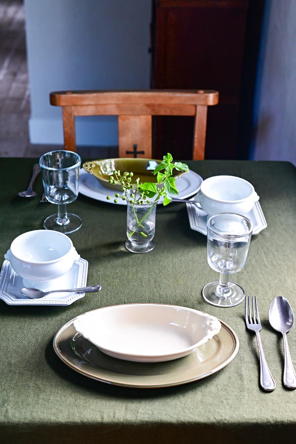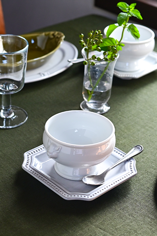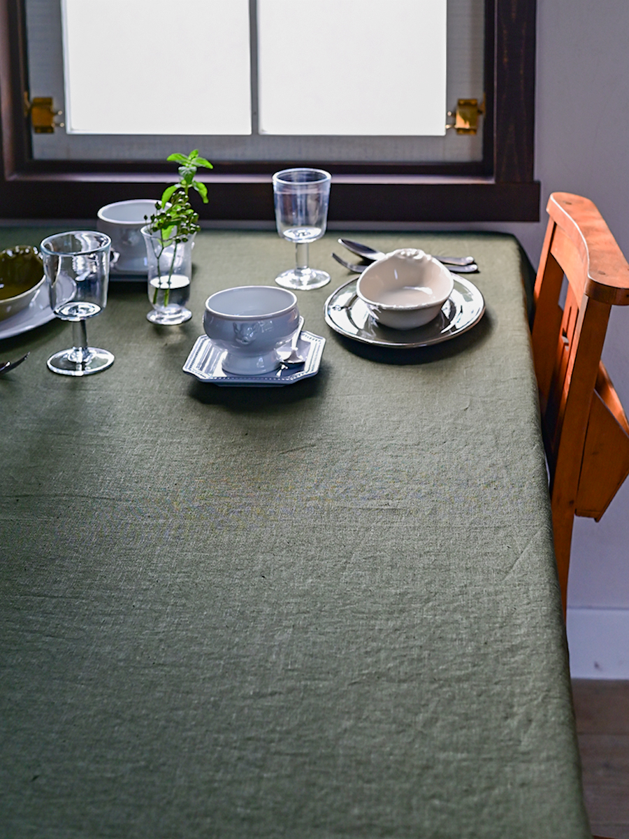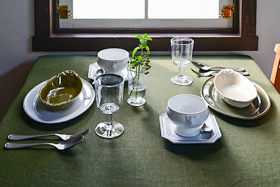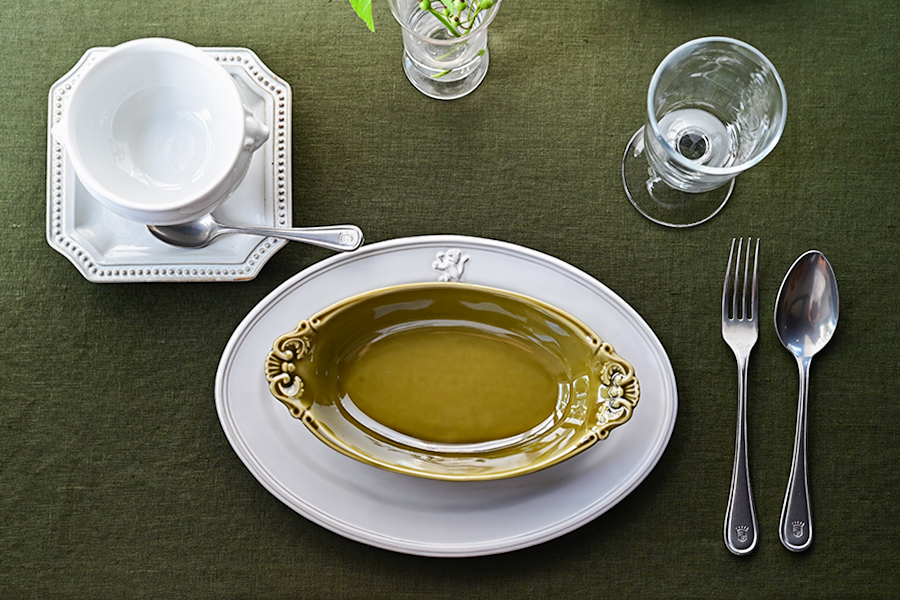 オリーブ色のクロスに、エレガントな白とオリーブの器を合わせたコーディネート。温かみのあるクロスと陶器の組み合わせが、季節の移ろいをやさしく映し出します。細やかな装飾をあしらった器を組み合わせることで、大人の華やぎと落ち着きを添えています。