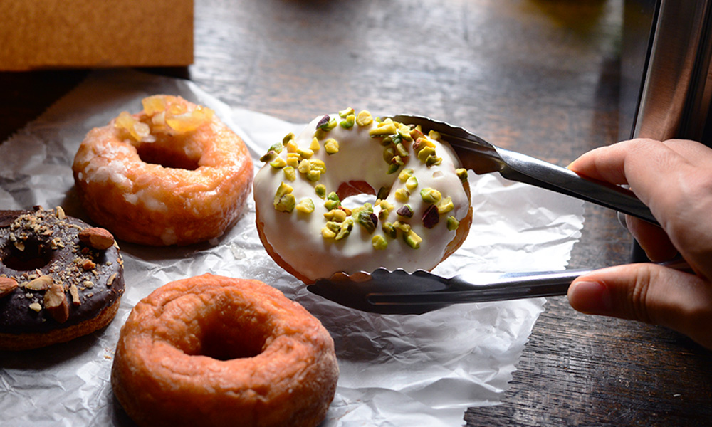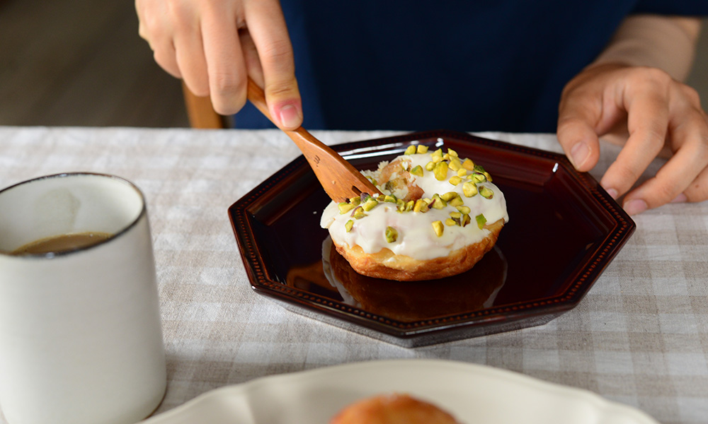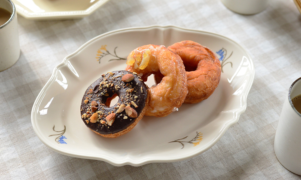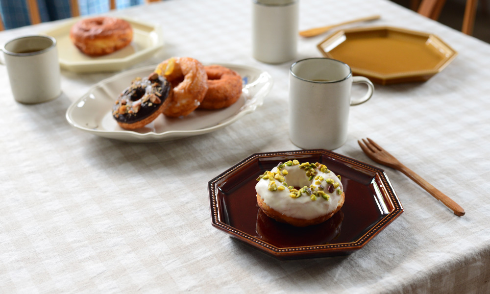 今回は、素朴な生地に彩り豊かなトッピングをまとったドーナツ。小さな甘いご褒美を、器とともに楽しみます。