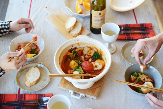 味噌汁は寸胴型で安定感のあるフォルムのマグカップに。 カジュアルな形状と赤土を使ったシックな素材感が魅力。