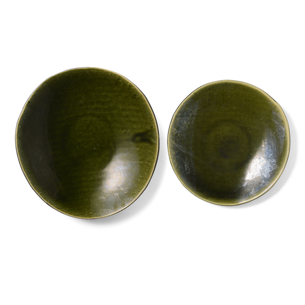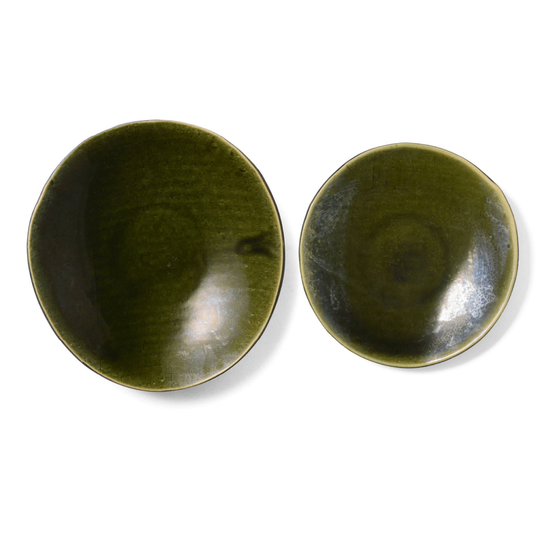 深い織部の色合いが美しく、厚くたわんだ形状が存在感のある器。