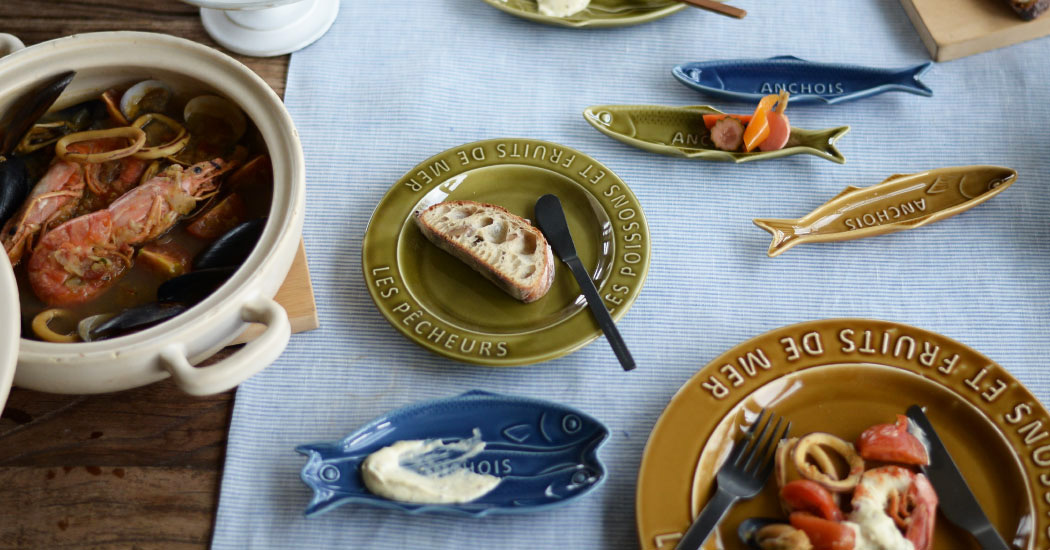 漁師町のレストランで使われているという設定で食器をイメージ。リム部分に大きく入れた凸文字が料理やテーブル全体を活気あふれる雰囲気に。いわしをモチーフにした小皿も調味料や薬味、ソースなどを盛ってテーブルの上を泳がせてみて。