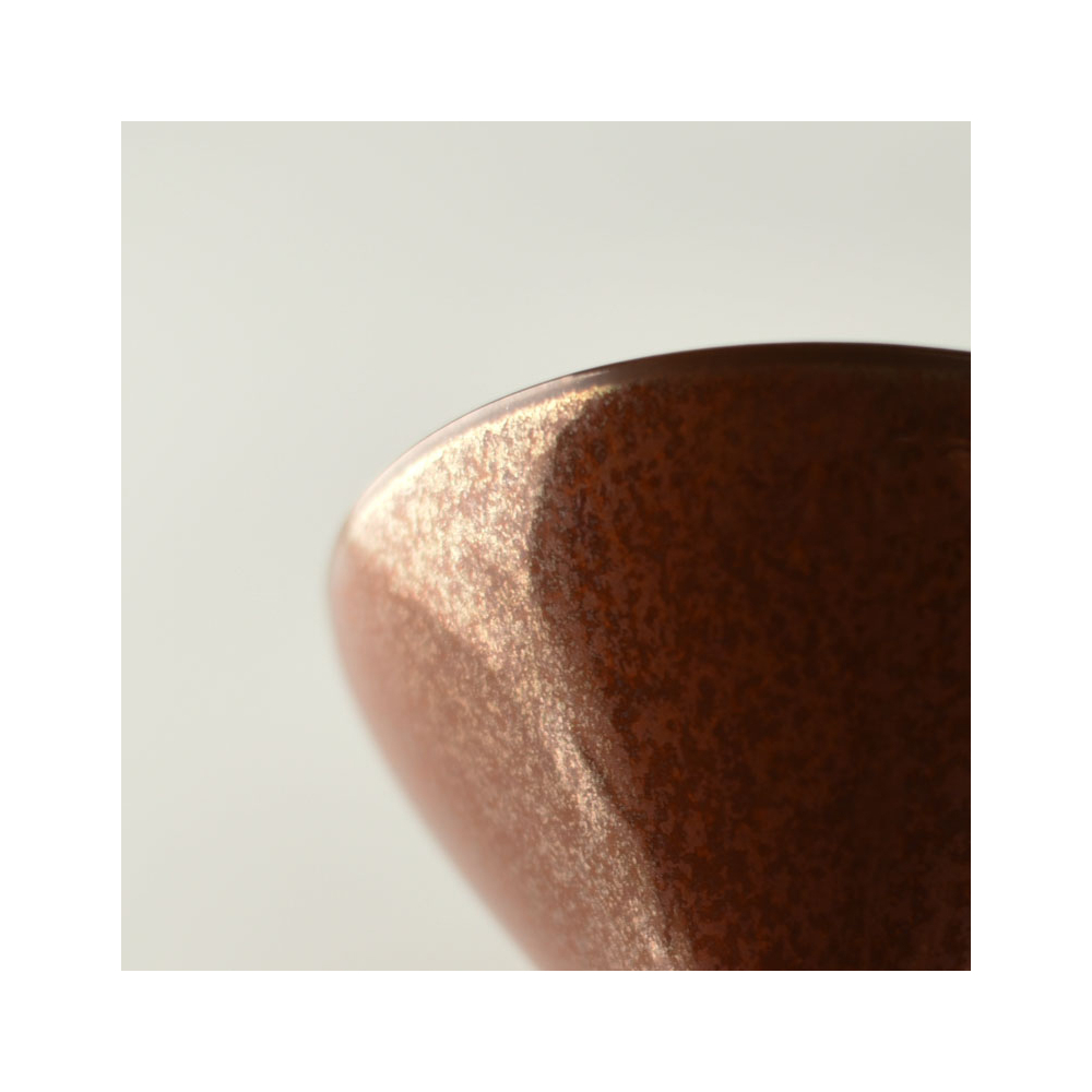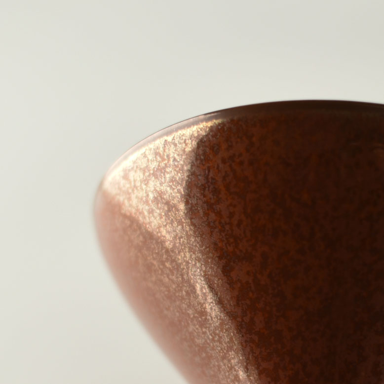 一個体の中で、釉薬や化粧土のムラがでます。1つの器の中において、色の表情が均一ではない箇所がある場合があります。器の形状などにより、釉薬の掛かり方が厚かったり、薄かったりする箇所があることが一つの要因です。それにより土の表情が一つの器のなかにおいても変化を見せます。