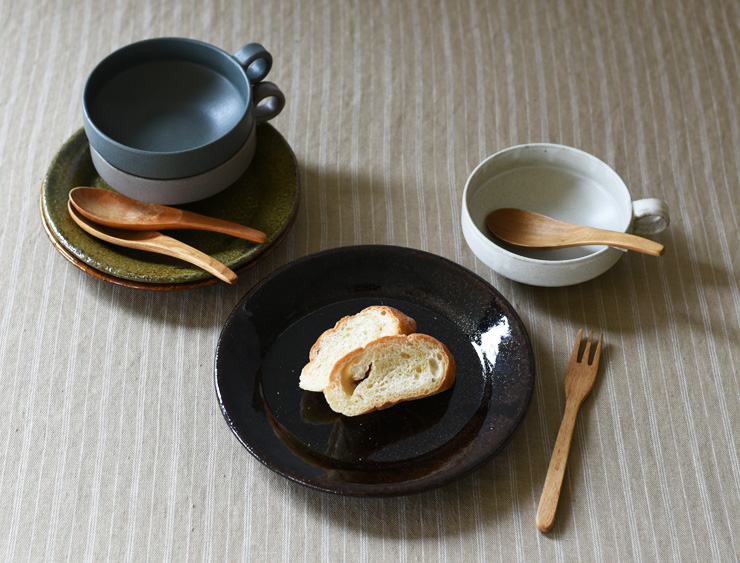ブラウンやブルーグレーも同様にそんな色味の変化がある釉薬をつかっています。