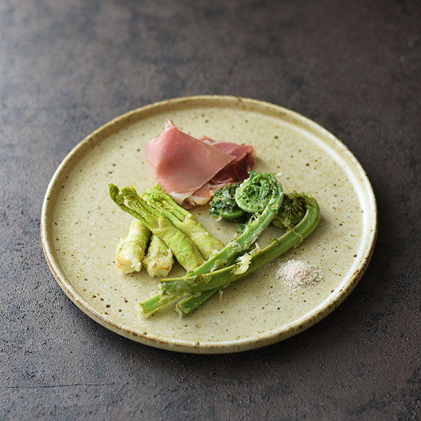サンドは名前の通り、ザラザラした砂や土壌のような質感。瑞々しい野菜やフレッシュな魚や肉の食材がより引き立ちます。