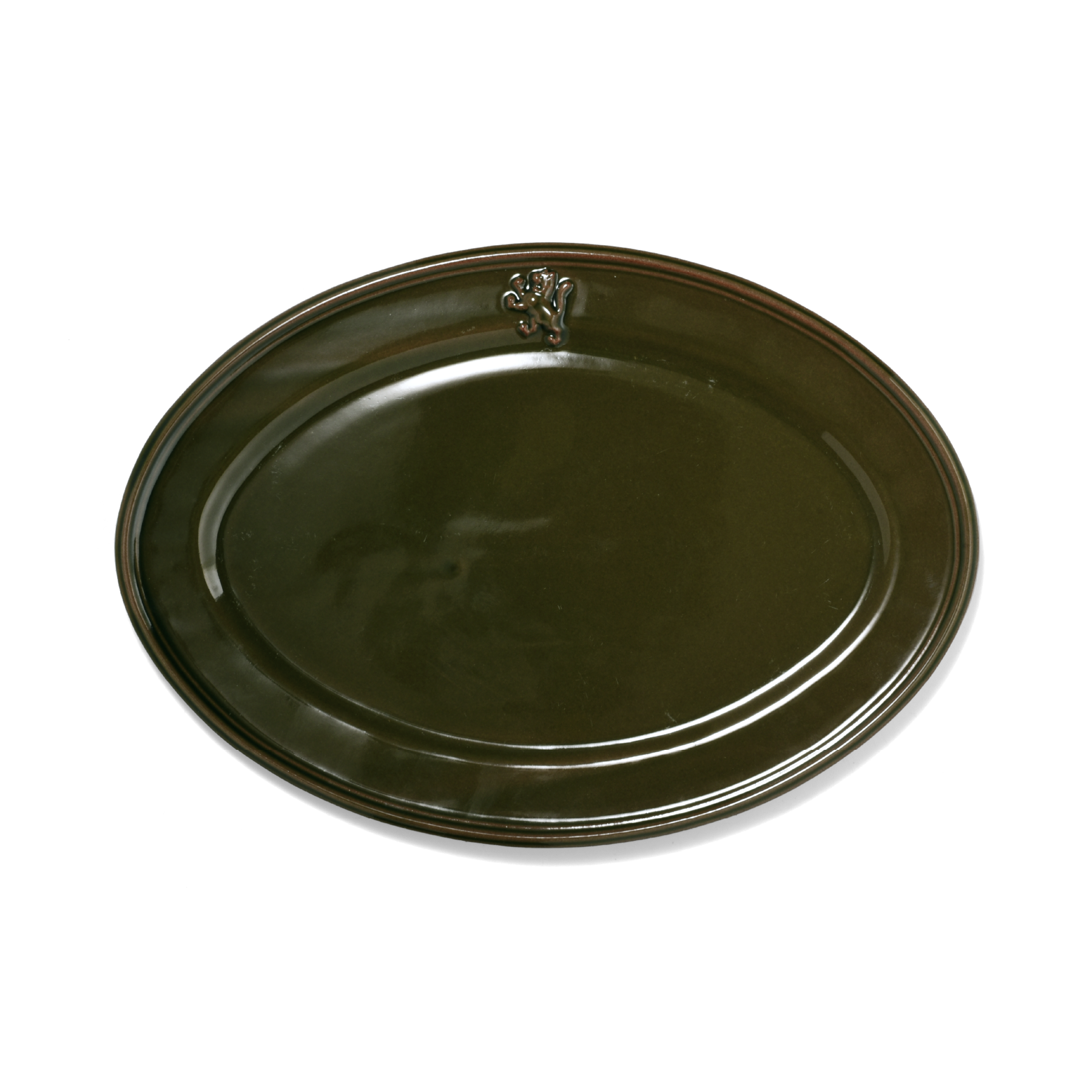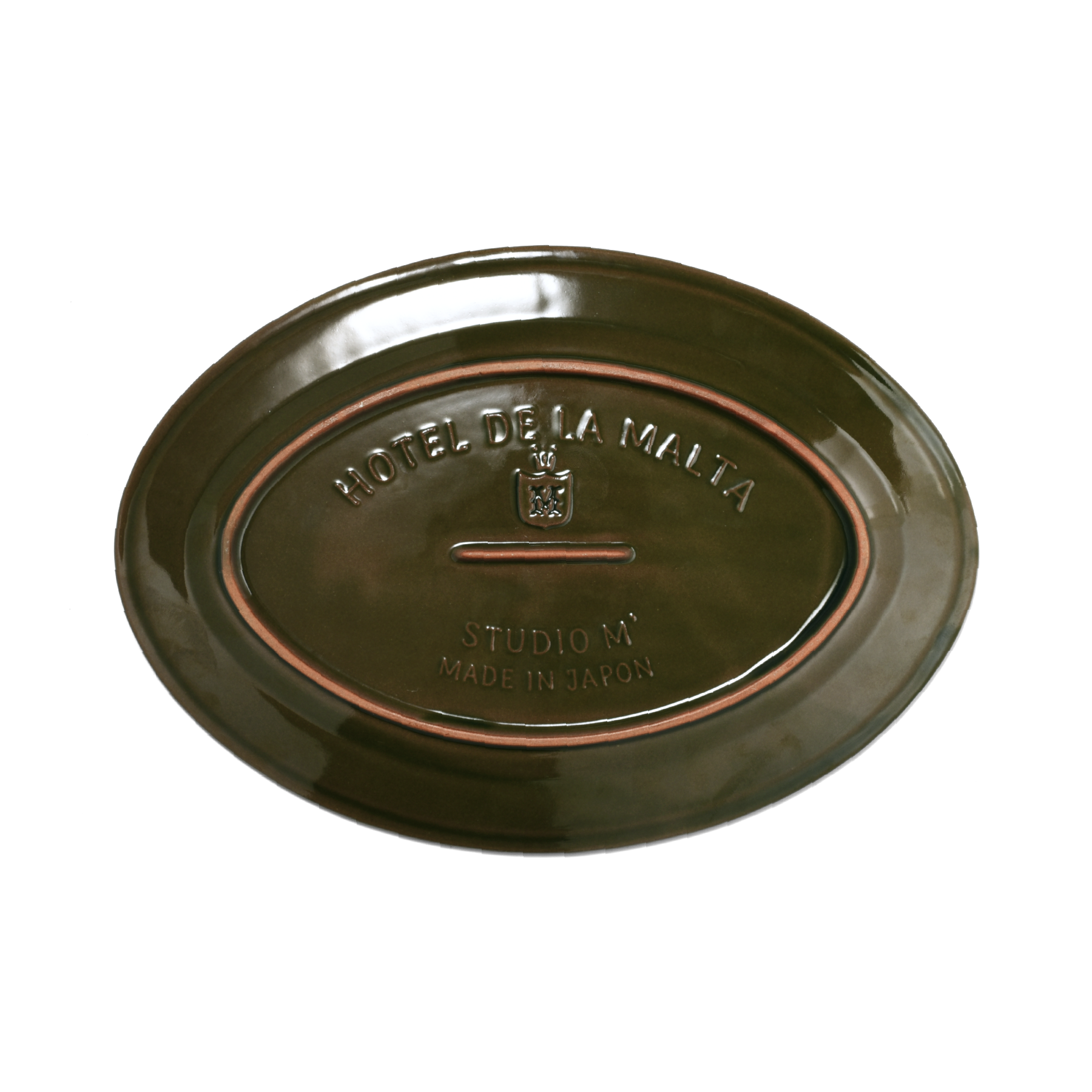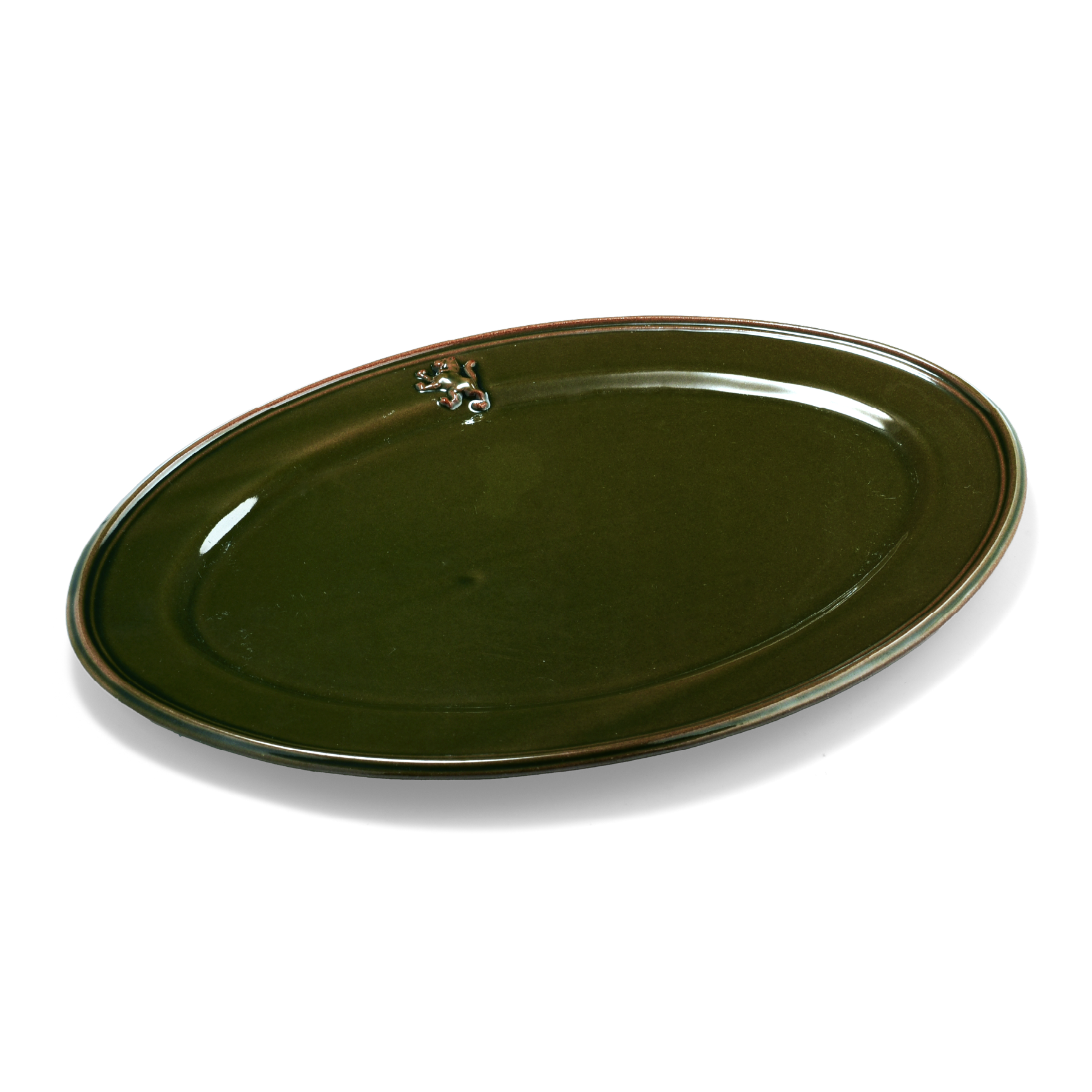 緑釉のオリーブはこっくりとした風合い、紋章風のレリーフもあることで年月を重ねてきたような重厚感があります。