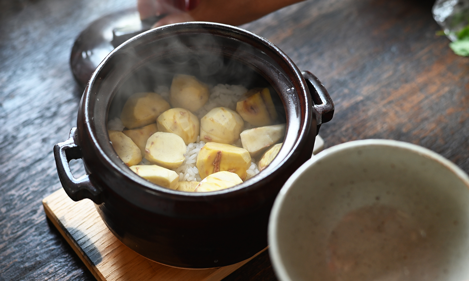 瑞々しい新鮮な食材とのコントラストはまるで大地と作物のような関係性を思わせる。