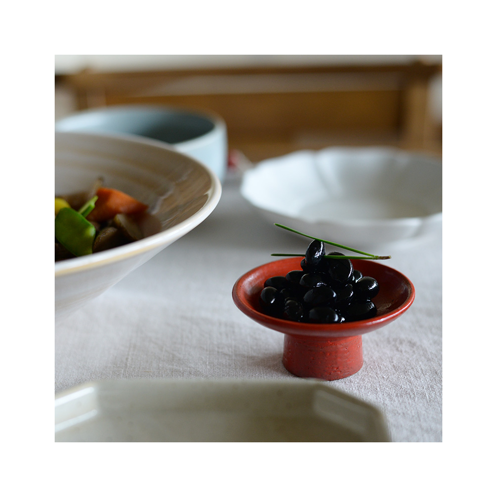 刷毛目を施した赤絵は、黒豆や栗きんとんなど正月料理はもちろん、