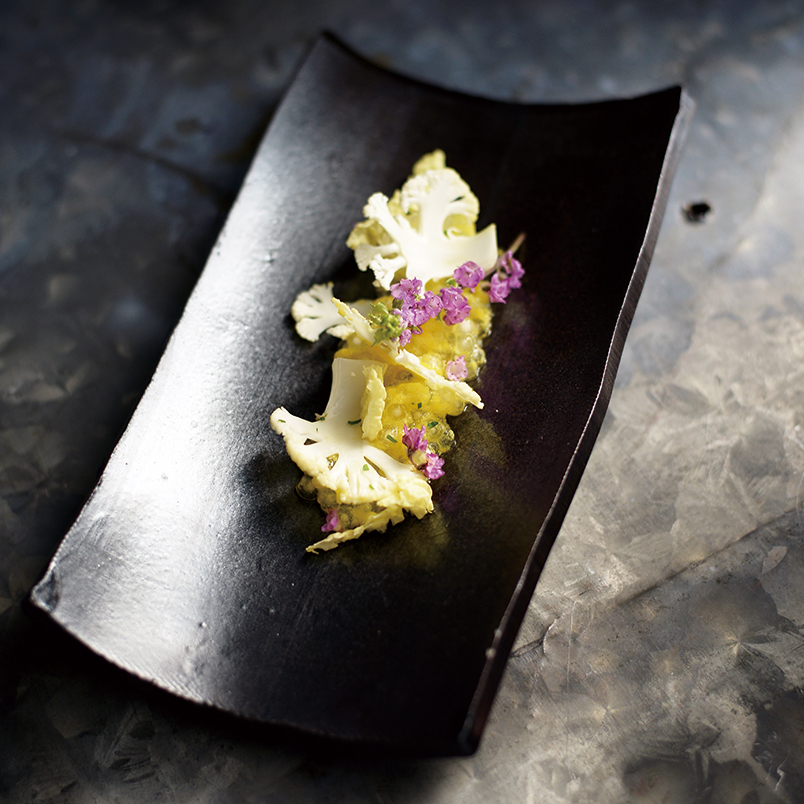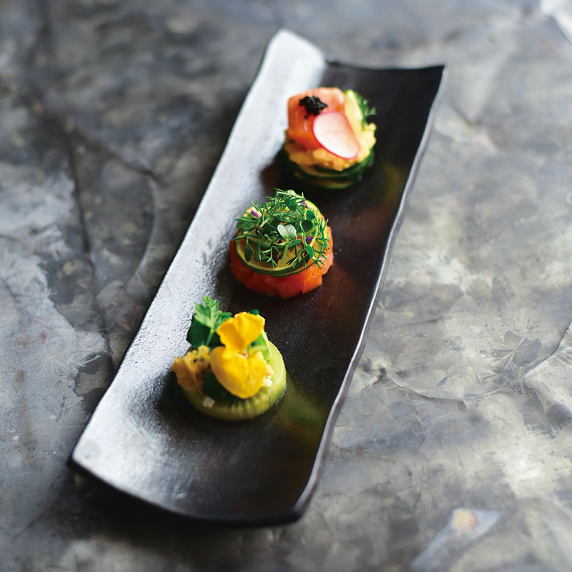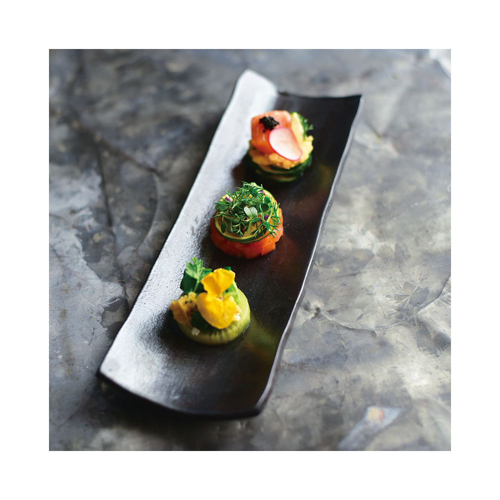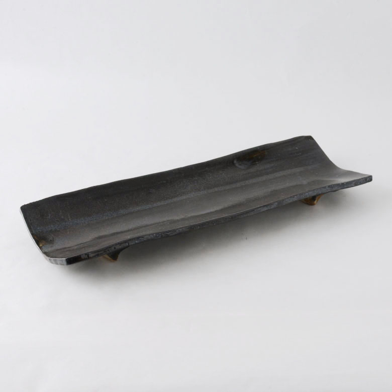 名前の通り、光沢のある黒さの奥に柿色がうっすら出る商品で、色を付ける際に一つずつ職人が刷毛で作業を行う為、深い味わいが出ます。また、1枚の板状の生地を手作業で成形する事で独特の柔らかいたわみがあるのも、特徴の一つです。足付で少し高さが出るので、食卓のアクセントになる器で、和食だけではなく、生ハムやローストビーフのような赤身肉をのせても盛り映えがしますよ。