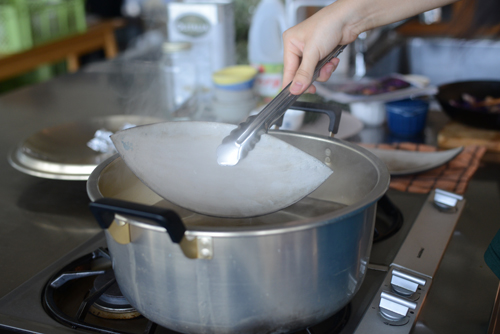 鍋に塩と水をいれてます。そこに器を入れ、沸騰させて火を止めます。