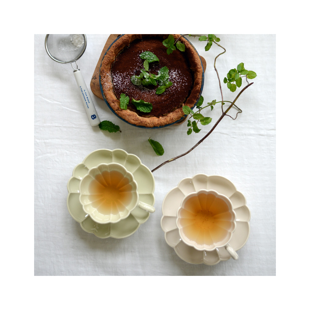 花型のカップ&ソーサーが並ぶテーブルは、まるで花束のように可憐で優雅な印象に。