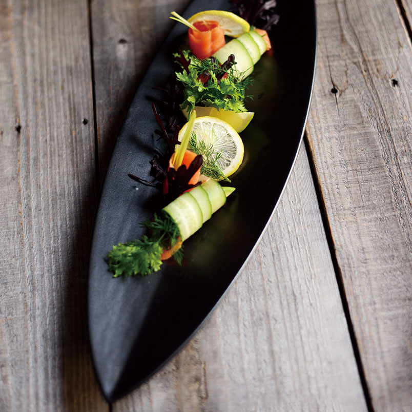 笹の葉がそのまま大皿になったような雰囲気で、自然の持つ優しくも力強い印象を持ったシリーズ。スッと伸びたラインと、コントラストの効く色合いが料理を引き立てます。シャープな印象ですが、盛り面は滑らかに仕上げられているので、容易に美しい盛り込みができます。サイズは長盛皿と付出皿の2つで、カラーバリエーションも3色あるので、洋食にアクセントとしてなど、使い分けができます。