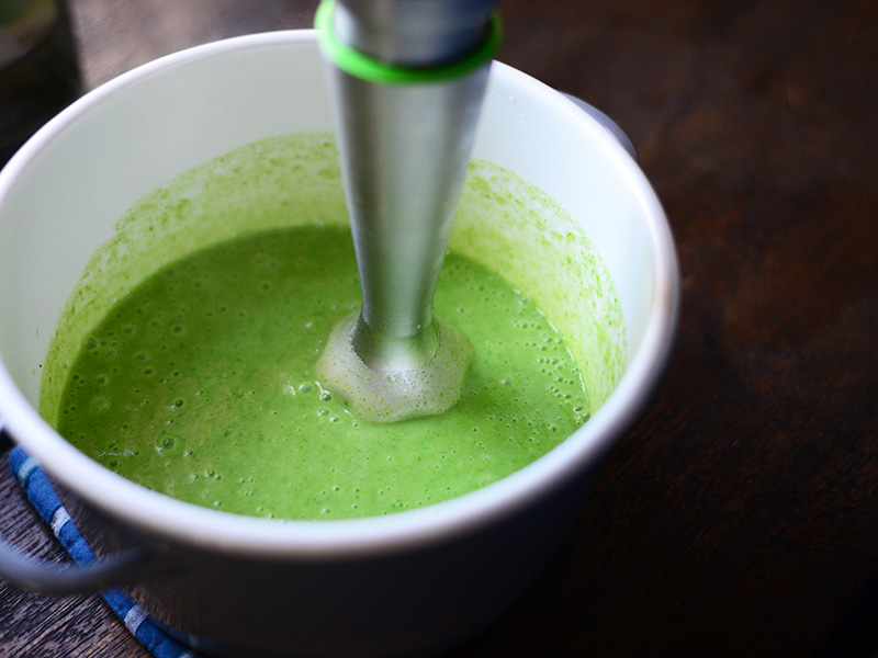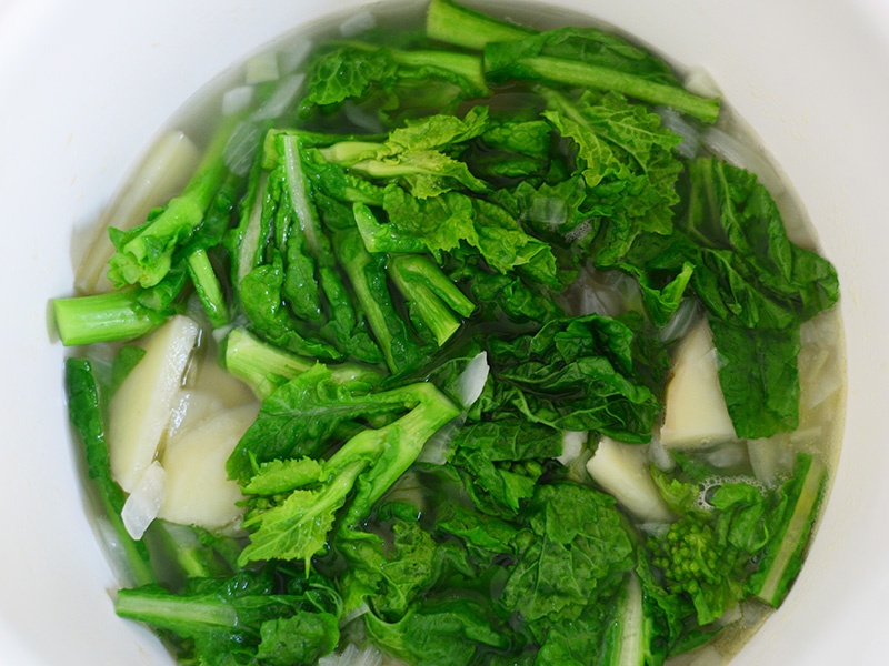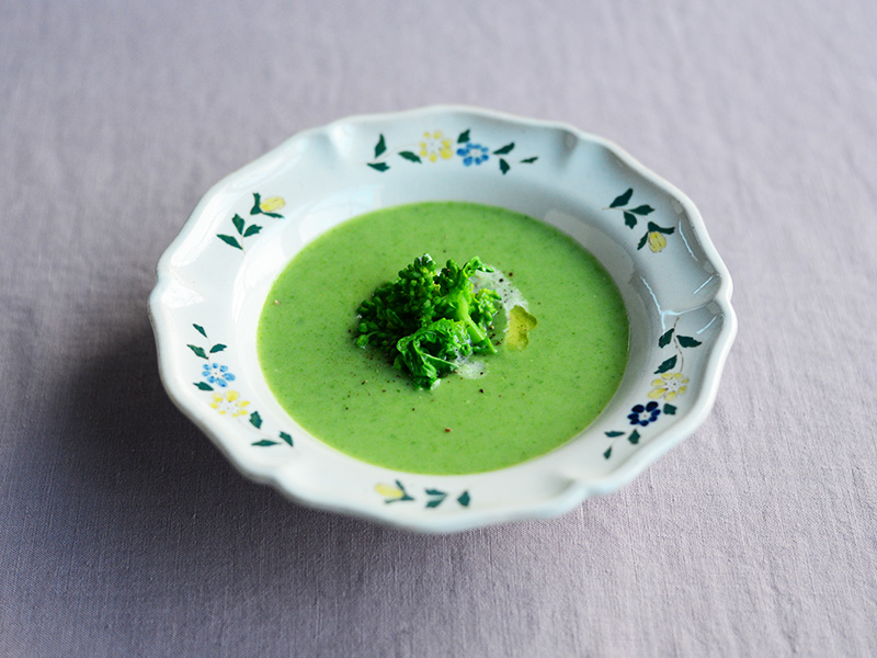 新玉ねぎと新じゃがをバターで炒めて水を入れ、沸いたら火を弱める。じゃがいもが柔らかくなったら、生の菜の花を加えて加熱するだけ。ブレンダーで滑らかにしたら、好みで生クリームか牛乳を加え、塩こしょうで味を整える。菜の花のほろ苦さが引き立つポタージュのできあがり。