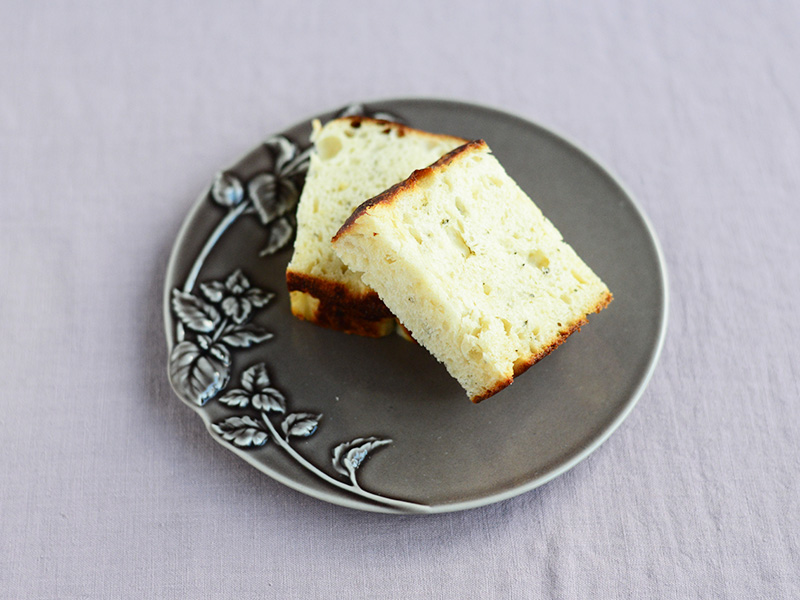 立体的な装飾が印象的なプレート。ローズマリーをアクセントにしたフォカッチャをのせて。シックでニュアンスのある色が魅力。