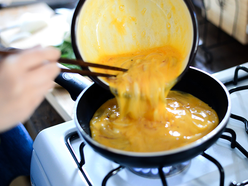 フリッタータは新玉ねぎを塩を少々ふりながら炒め、粗熱をとる。パルミジャーノ入りの卵液に炒めた玉ねぎを入れ、フライパンで焼き上げる。