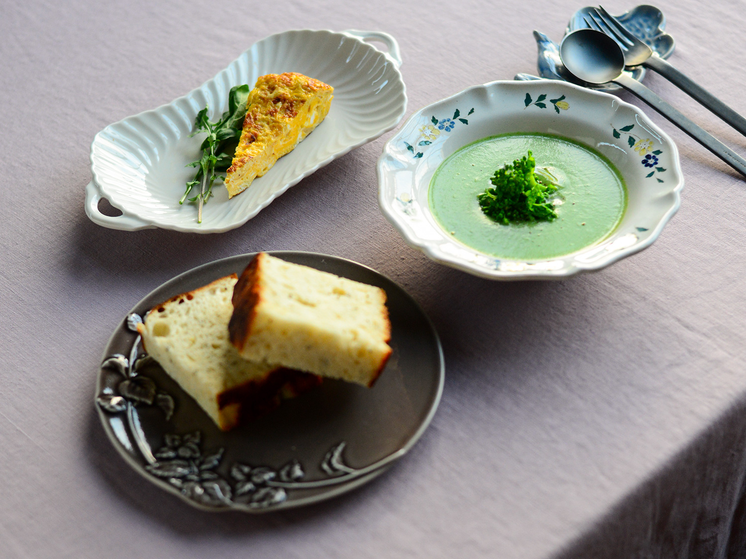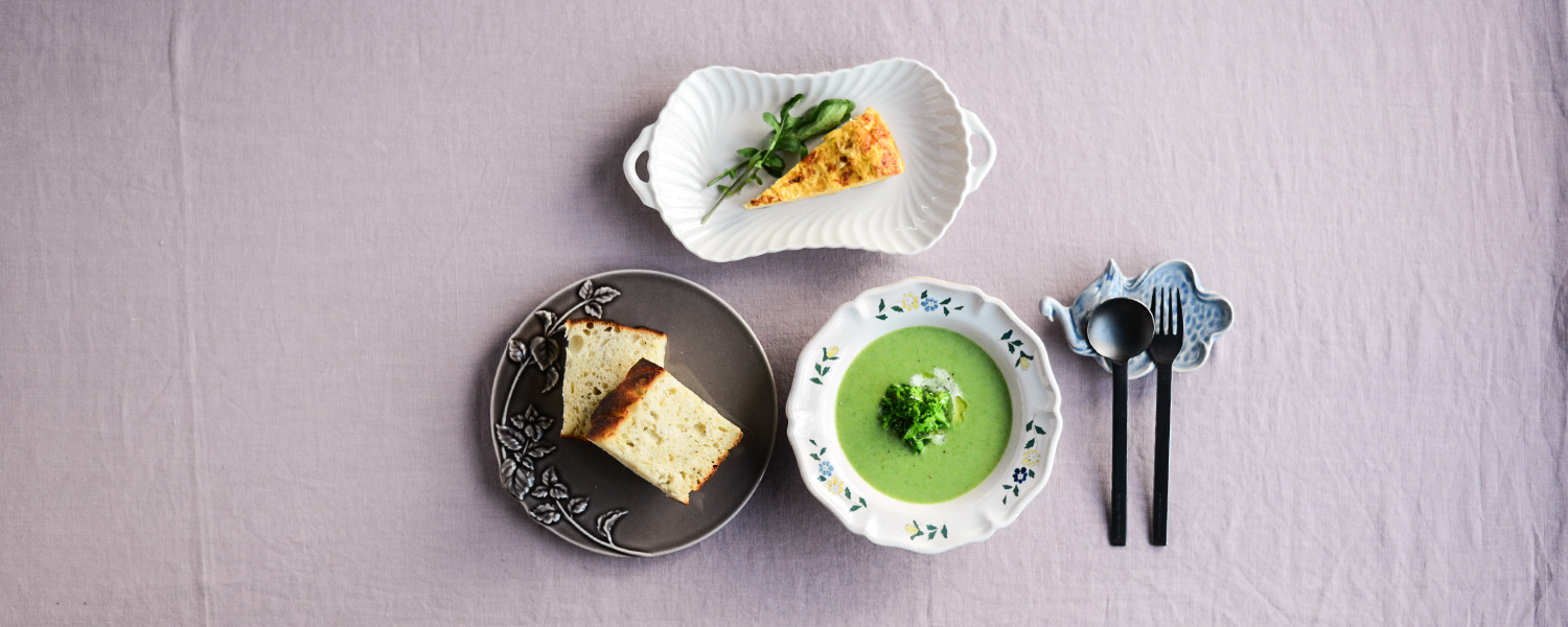 芽吹きの季節に合わせて選んだのは、いきいきとした植物が描かれた器。存在感のある器を合わせて、新しい一年の始まりをお祝いする晴れやかな食卓に。