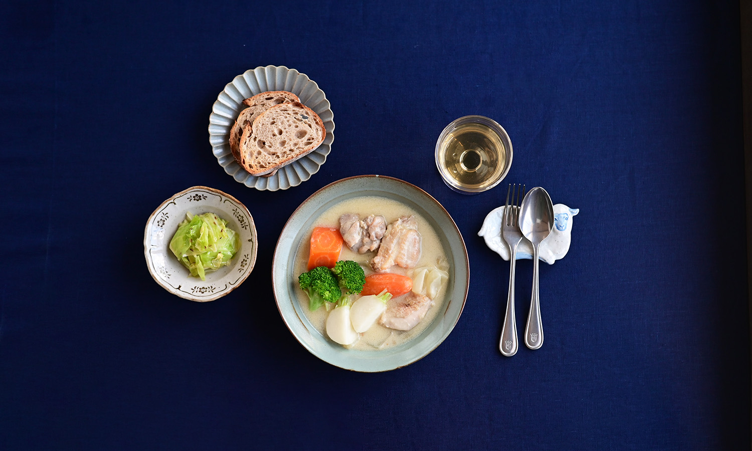 カトラリーレストはひつじモチーフの染付の豆皿を。