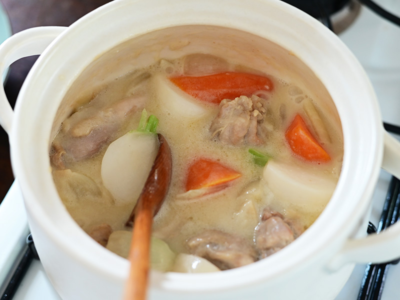 水を入れて煮込み、野菜が柔らかくなったら牛乳とバターを加え、とろみがつくまで煮込みます。
