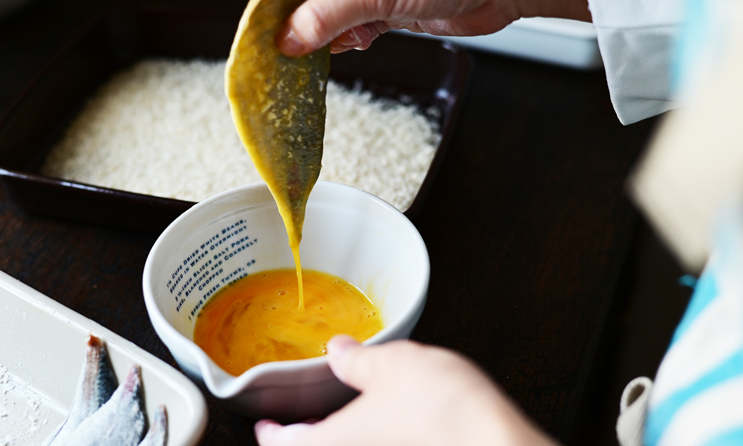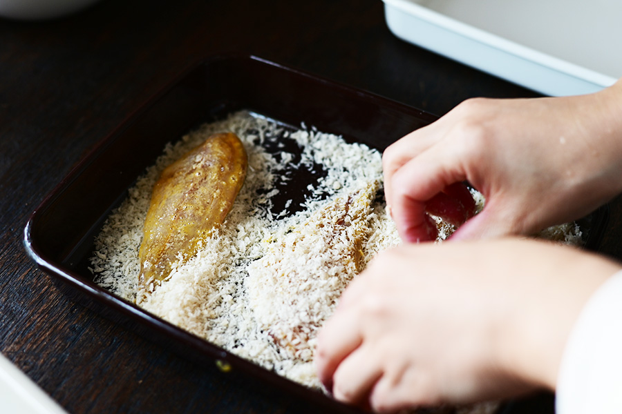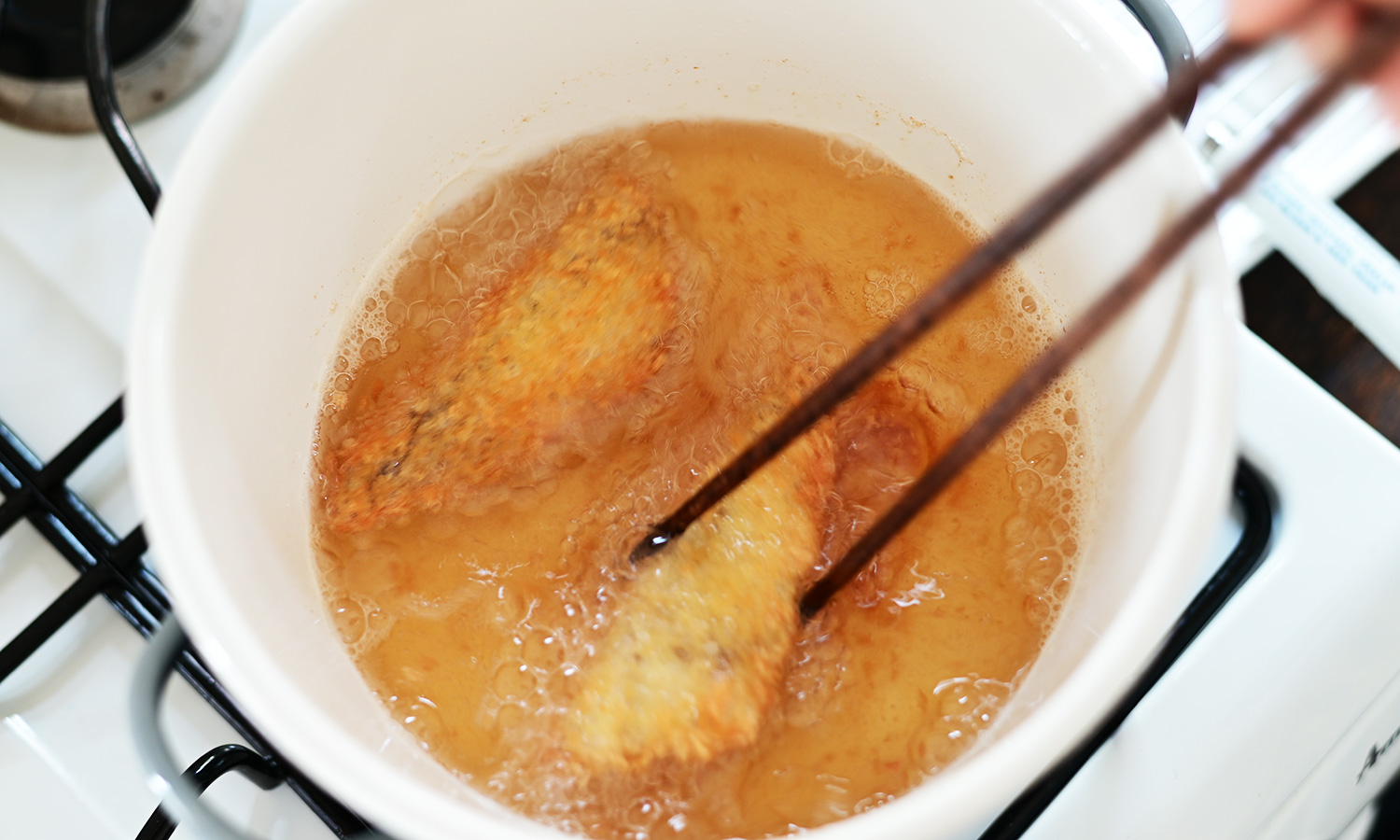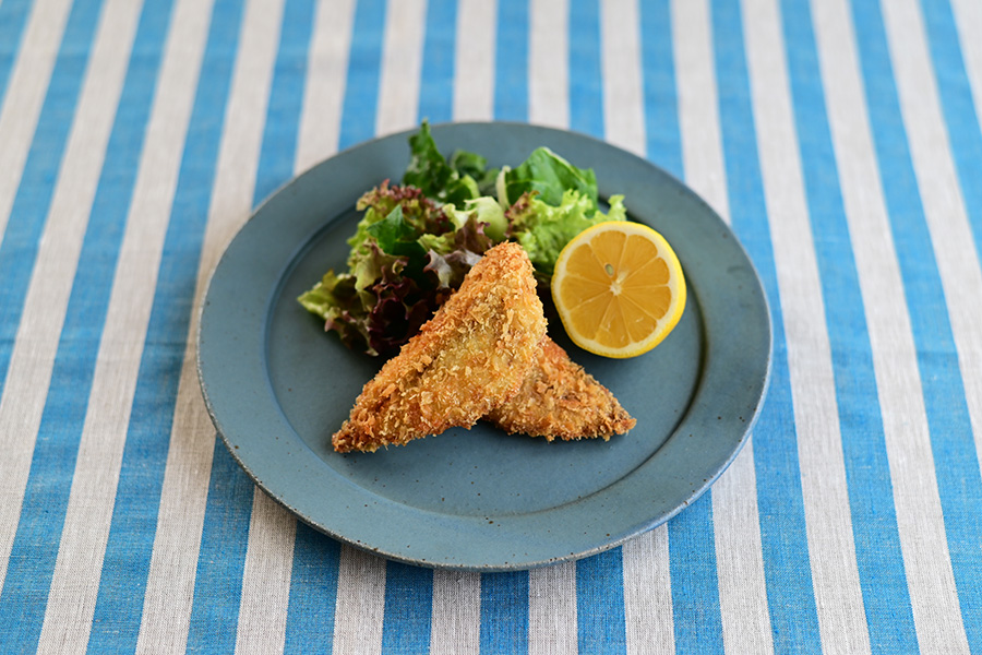 塩をふり、薄力粉、溶き卵、パン粉を順につけ、中温の揚げ油で色良く揚げる。