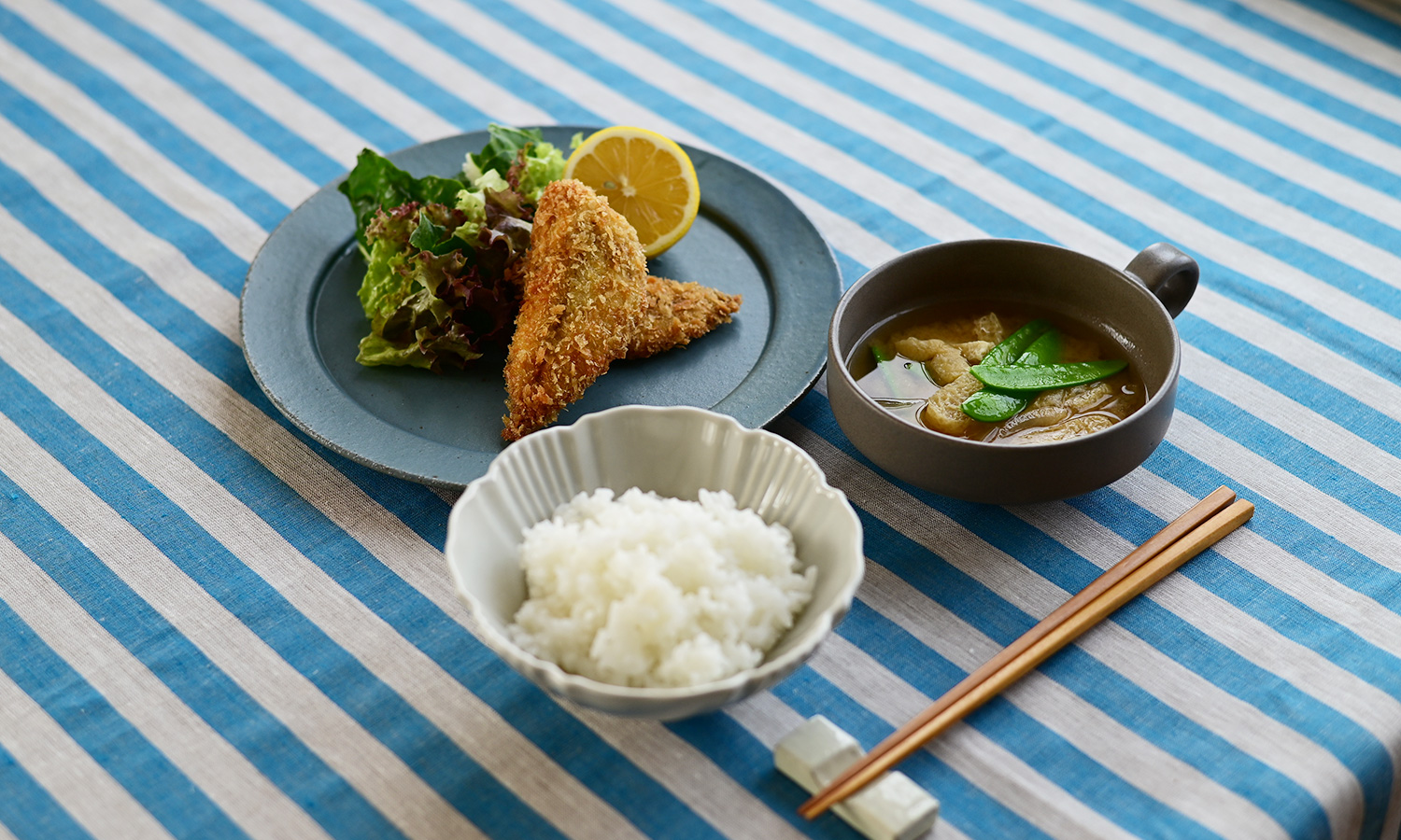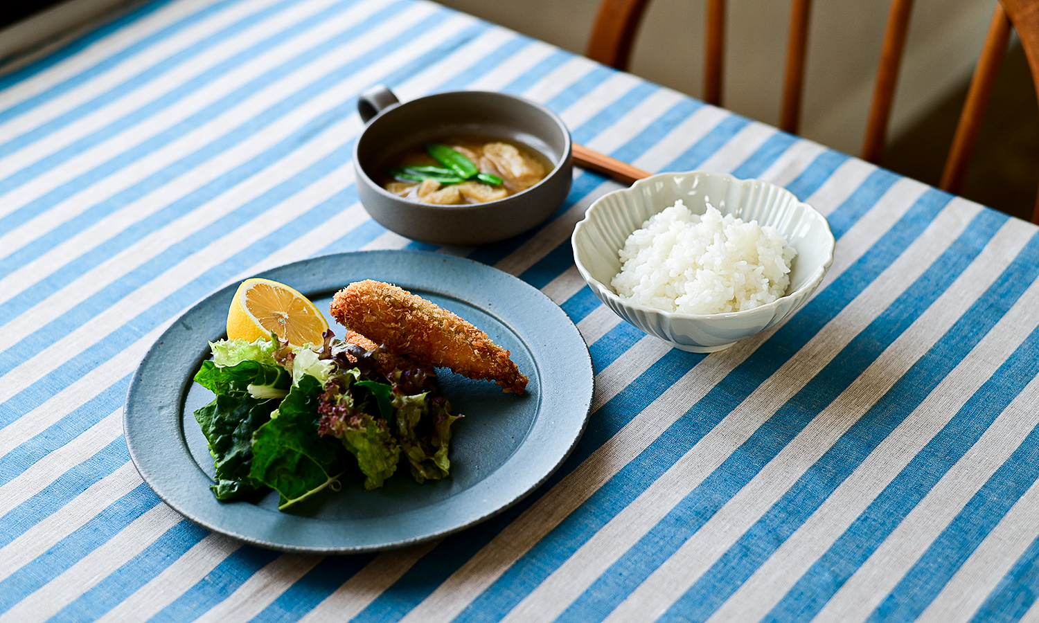 ブルーグレーの色合いが、家庭的な料理を新鮮に見せてくれる。