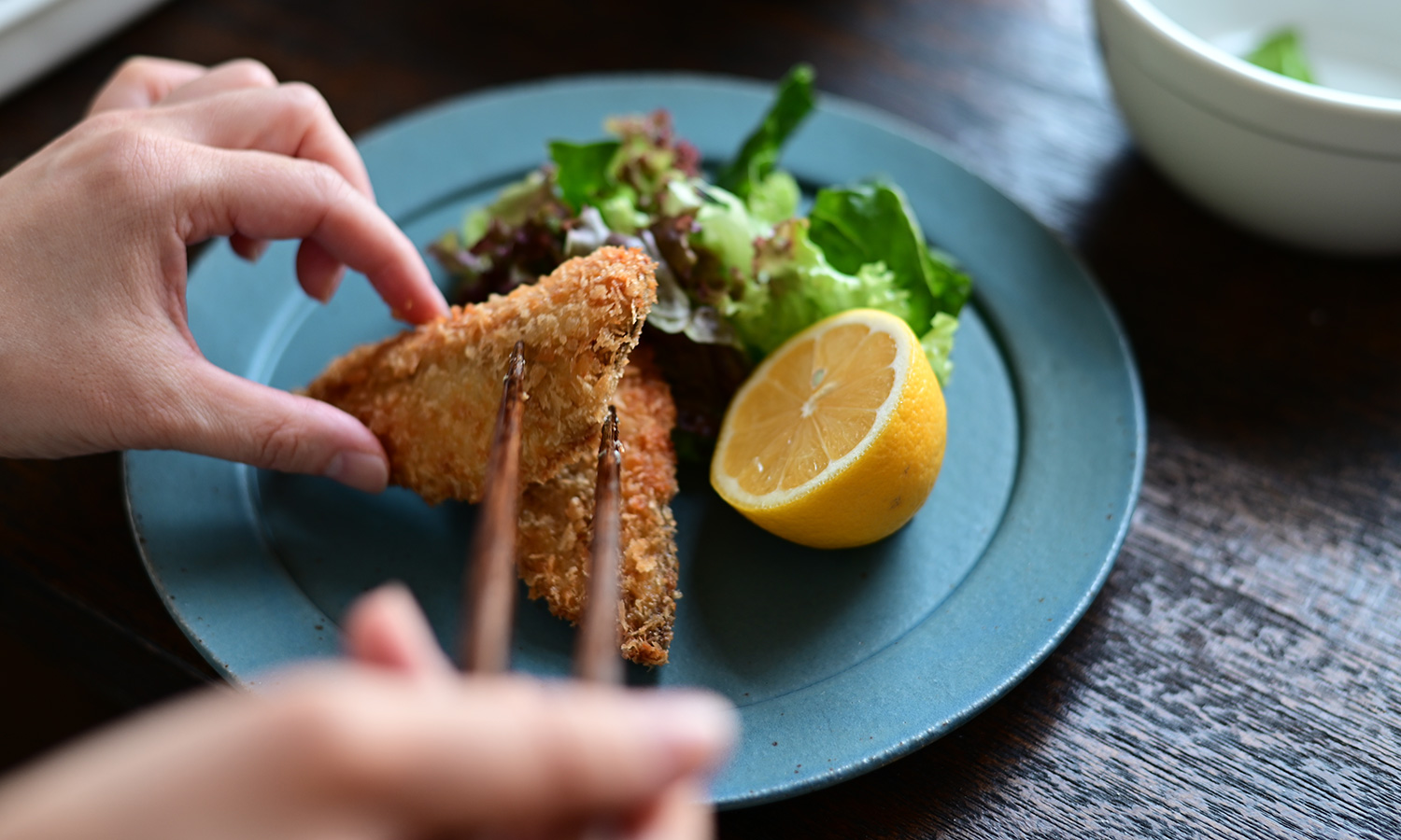 アジフライを盛りつけたのは、鉄粉など土の素材をいかしたリムプレート。