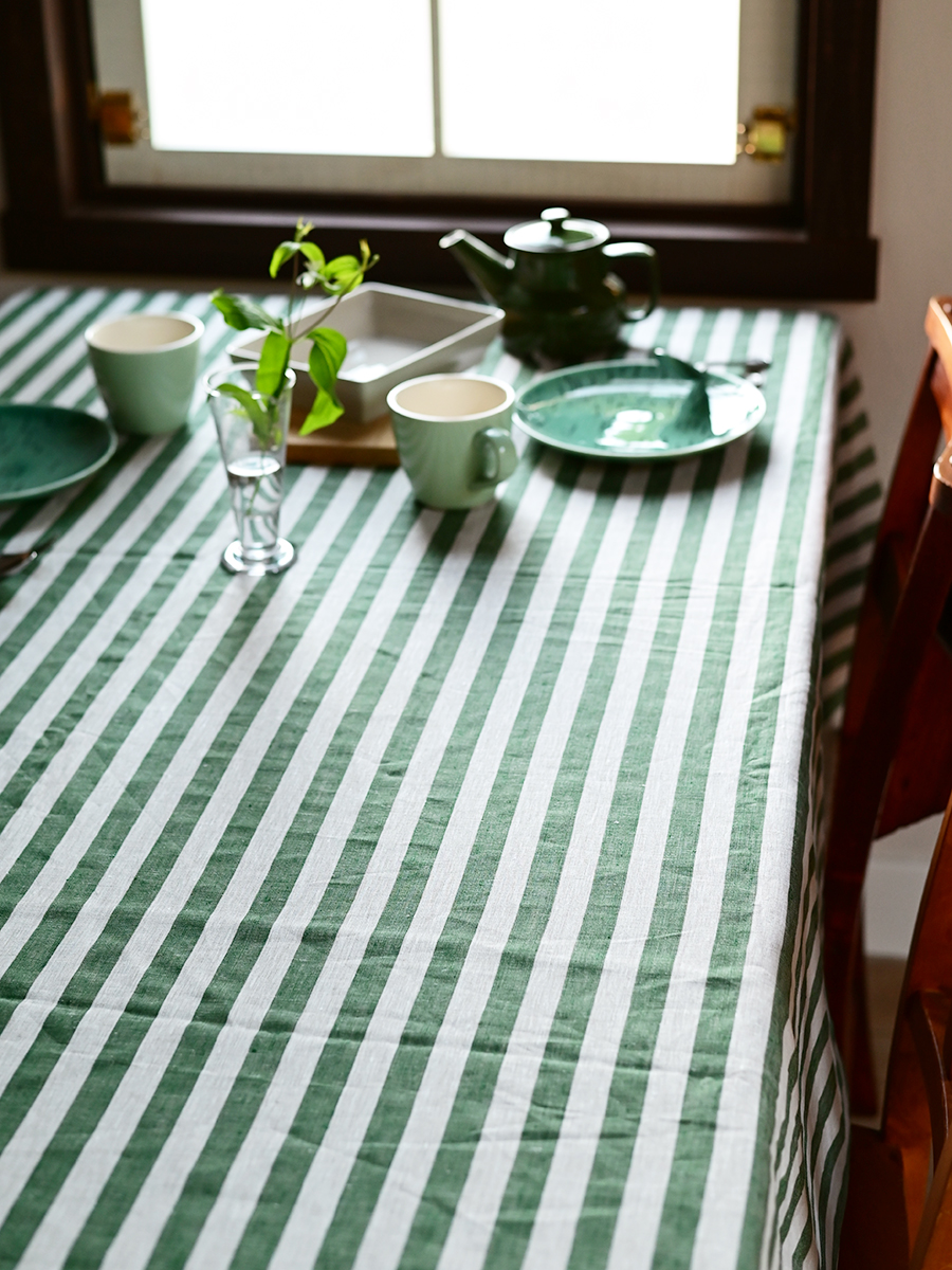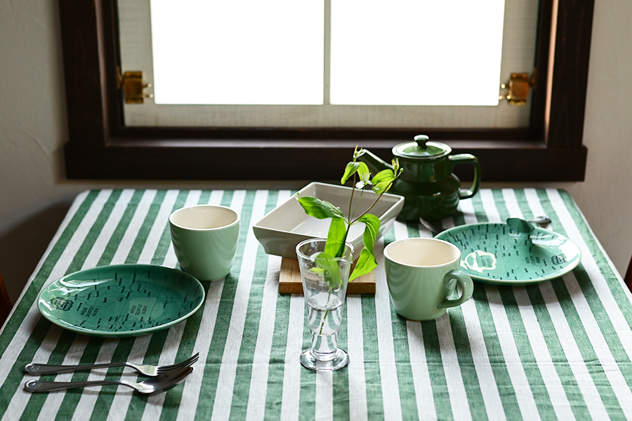 ジャルダンという名前には、フランス語で「庭」という意味があります。その名の通り、庭先に張り出すテントやパラソルをイメージしたストライプ生地は、思わず外へ繰り出したくなるようなシリーズです。ベースの生成色と落ち着きある緑色のバランスが良く、日常の食卓も華やかに早変わりします。