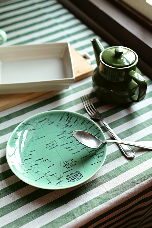 地球儀をモチーフにしたグローブプレートは、旅をテーマにしたストーリー性をテーブルに加え、自然と会話が弾む食卓を演出。 シンプルな食器との組み合わせによって、プレートの個性を一層際立てるテーブルにしました。