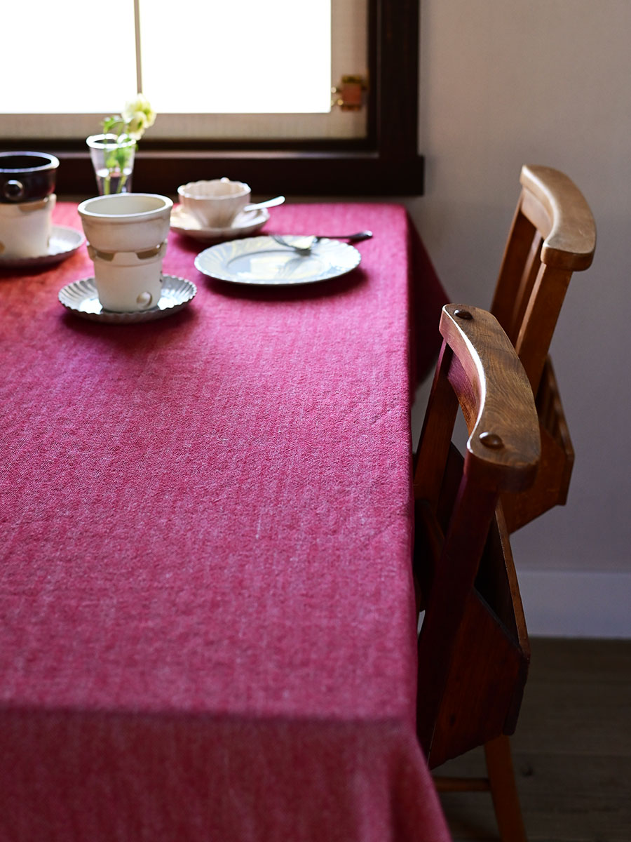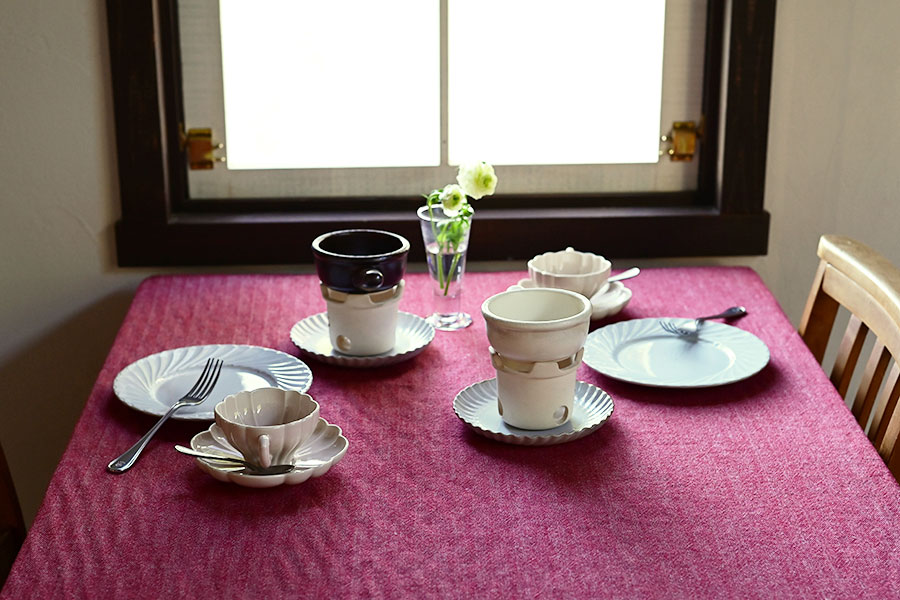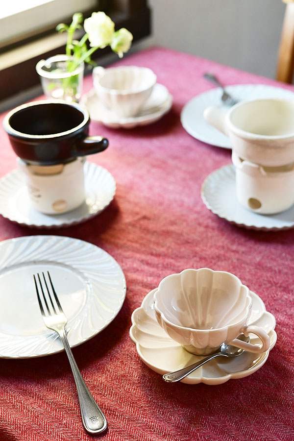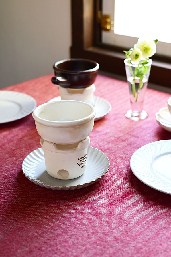 素材感のある赤のクロスに愛らしい器を合わせた、冬にぴったりなコーディネート。 ウール素材のクロスは、その質感がテーブルに温かみと季節感をプラスしてくれるアイテムです。 取り入れるだけで、冬らしい雰囲気を簡単に演出できます。 器も素材感のある陶器素材を中心に取り入れることで視覚的に温度感の高いテーブルに仕上がります。 小ぶりで丸みがあるフォンデュ用のプルッフセットは、周りの器と調和しやすいですが、高さがあるのでテーブルに変化を与えてくれるアイテムです。