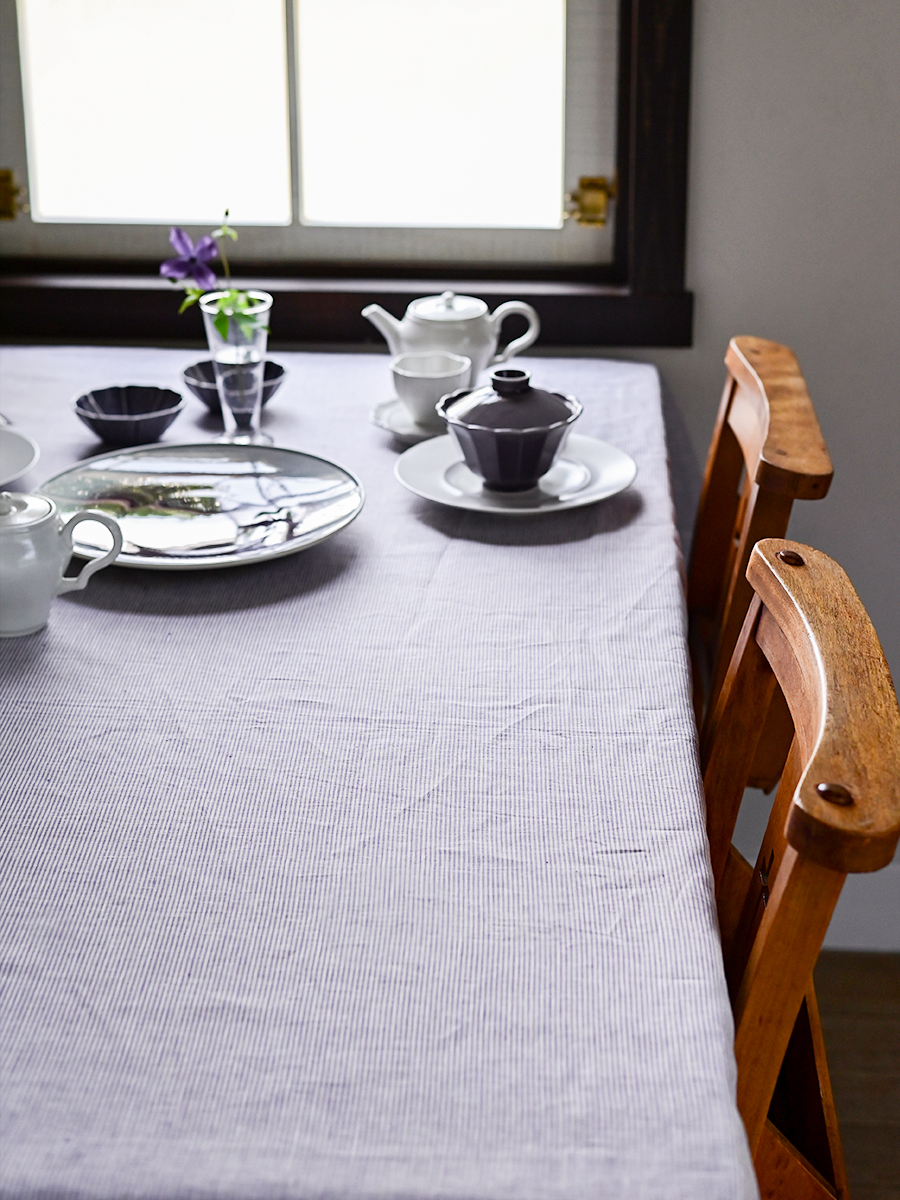 淡いラベンダーカラーに、シャープなストライプ柄がさりげなく効いたリネン生地。主張しすぎず清涼感を感じさせてくれるこのクロスは、上品でやさしく、すっと自然に馴染んでくれます。生地のハリ感の強さも特徴的で、日々のテーブルに落ち着きのある空気感をもたらし、洗練された印象に。