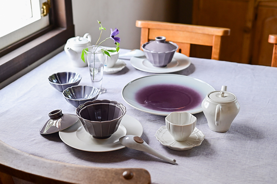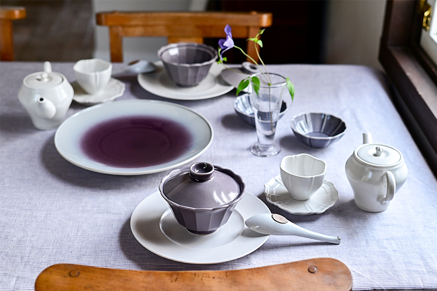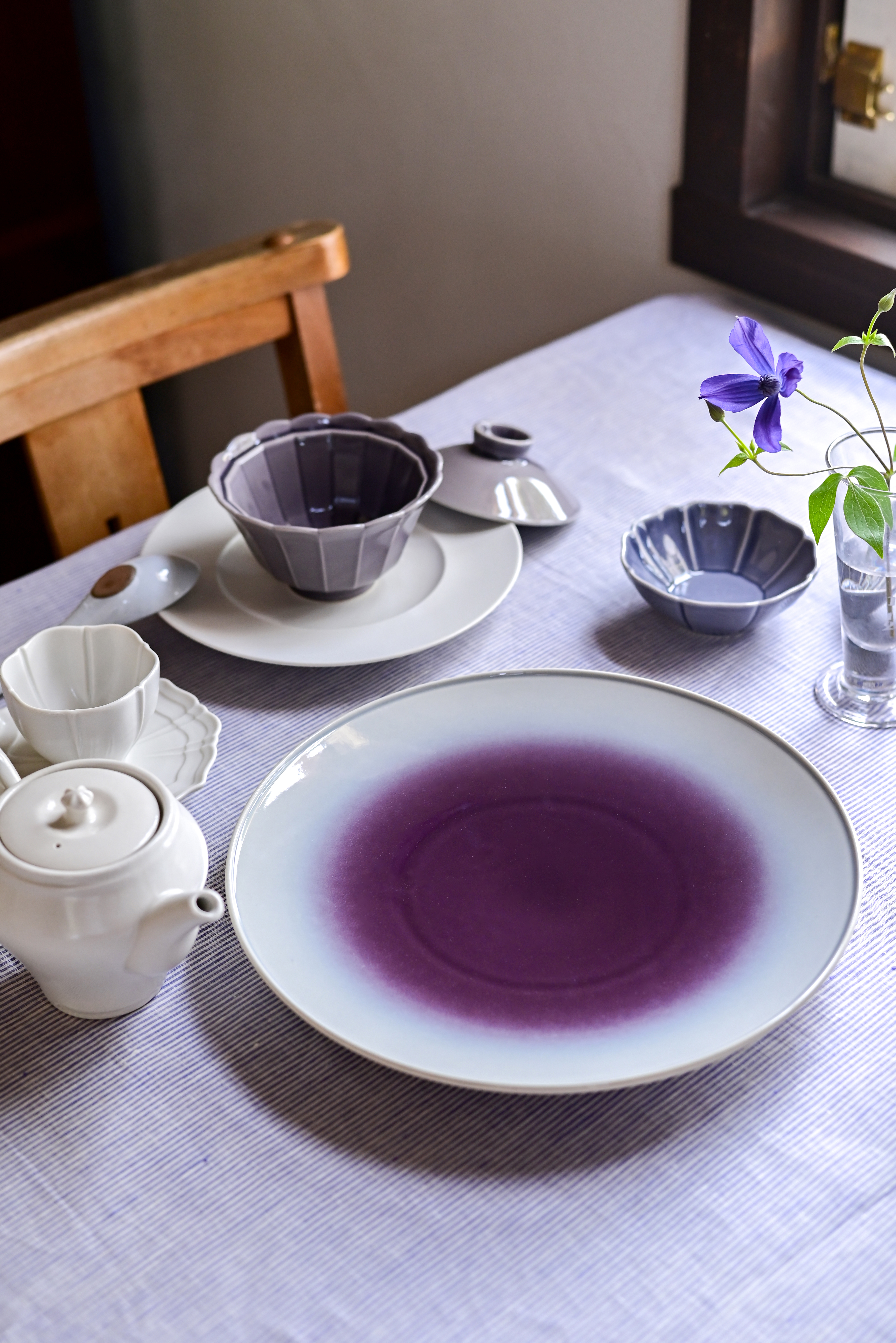 さらりとしたパープルのクロスと、鮮やかなパープルの器で楽しむアジアンなコーディネート。 白からパープルのグラデーションを意識した器を組み合わせることで、上品で落ち着きがありながらも華やかさのあるテーブルに。 マットと艶、質感の違う器を取り入れ、器の重ね使いをすることで、洗練された空間を作り出しています。
