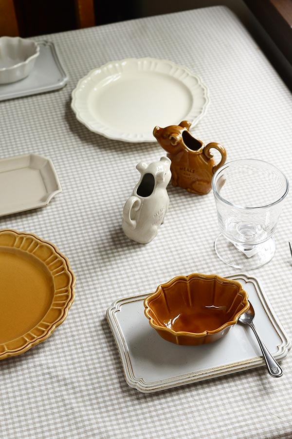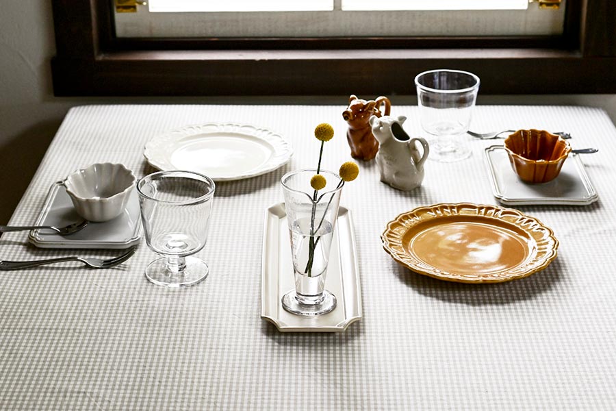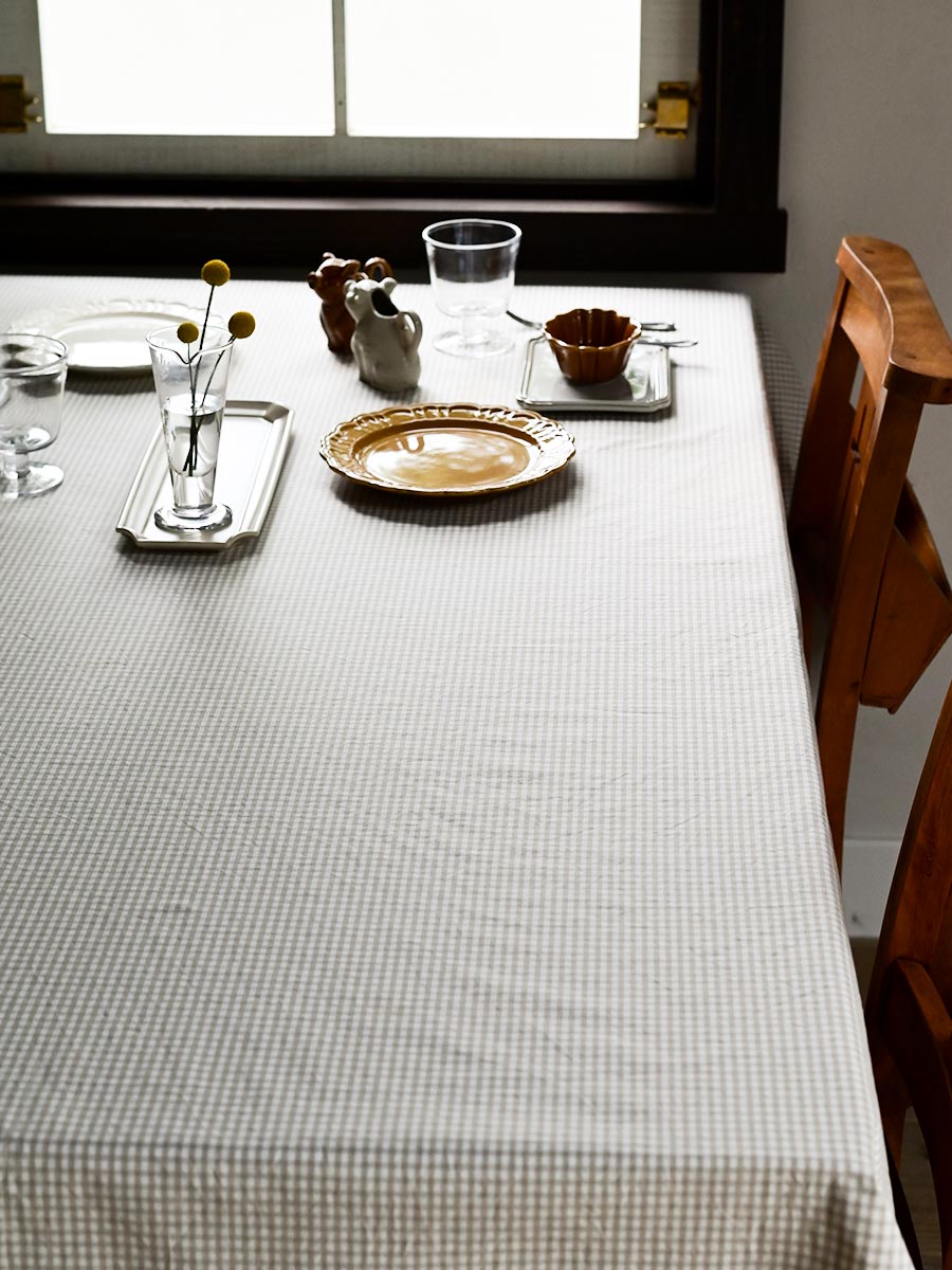 ハリのあるギンガムチェックのクロスは、朝の光にも映え、食卓を爽やかに見せてくれます。そこに温もりを感じる器を合わせ、白とキャメルの柔らかな色合いを加えることで、視覚的にもあたたかみのある空間が生まれます。