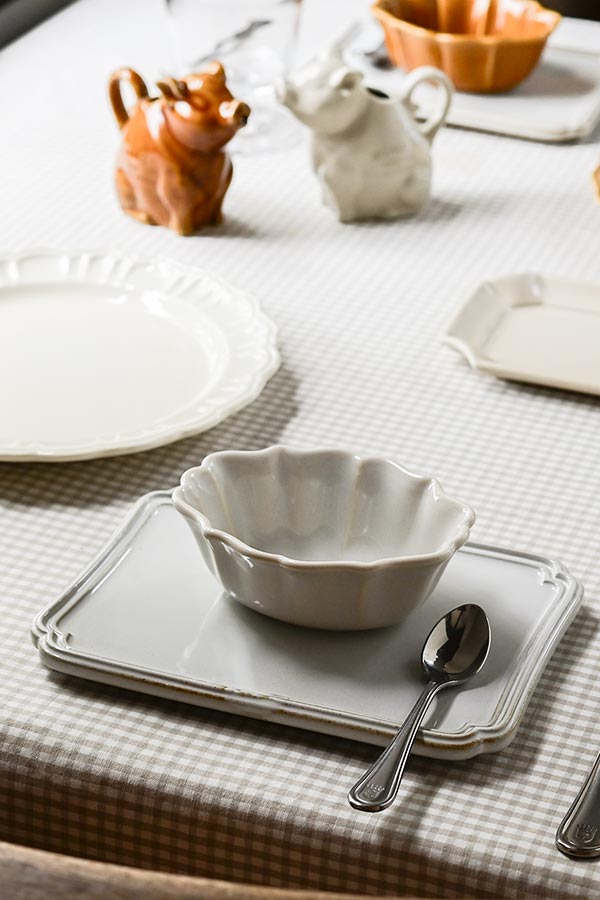 柄の直線に合わせてシンプルなフォルムの器を組み込むと、全体が引き締まり、印象がぼやけません。 さらに、フラットなプレートに深みのある小鉢を重ねると、自然な高低差がつき、視線が動く立体的なテーブルに。料理の存在感も引き立て、やさしくまとまりのある雰囲気を作ります。
