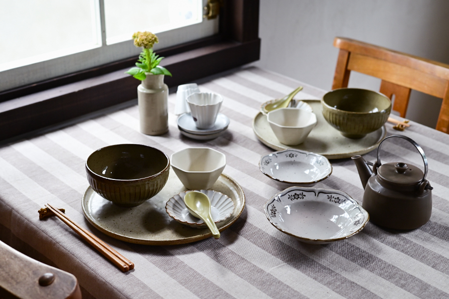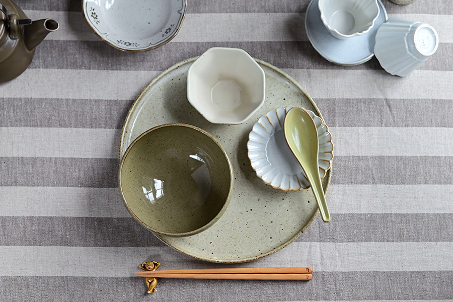 花柄や鎬(しのぎ)模様の器を取り入れることで、素朴ながらも印象的なテーブルに。雑炊や煮物などシンプルな和食を盛り付けても、寂しくならず、テーブル全体で季節感を感じられます。