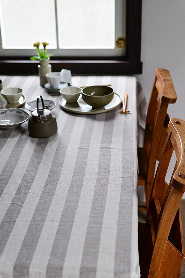 落ち着きのあるこげ茶色と亜麻色が組み合わさった太めのラインが印象的なオックスストライプ。オックス生地は縦横の糸を複数本揃えて織る特徴があり強度と耐久性に優れます。ふっくらとした触り心地はリネン特有の柔らかさを感じられ、素朴で飽きのこない素材は毎日の食卓を心地よい時間にしてくれます。