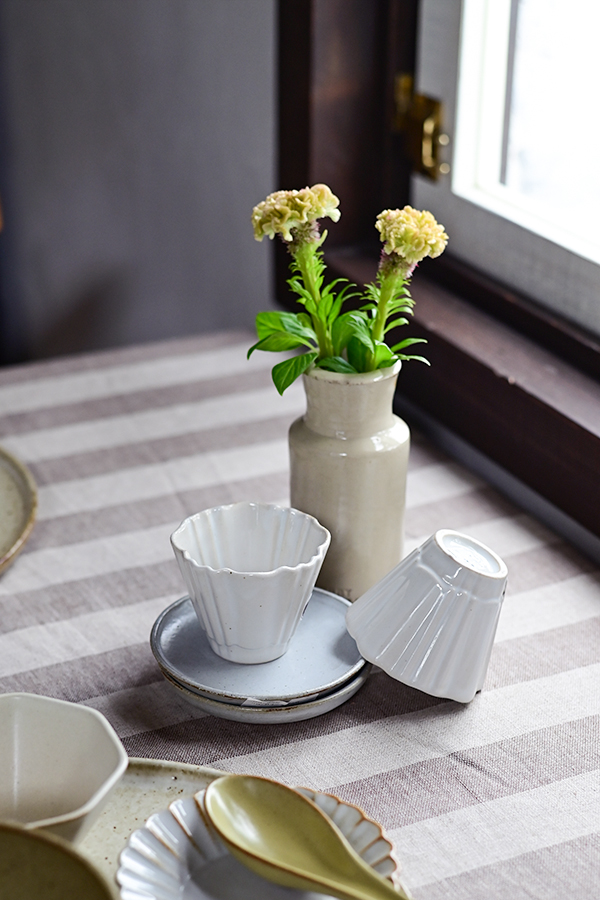 太めのストライプクロスを柔らかなベースに、和洋どちらにもなじむ器の色味や質感を引き立てたコーディネート。オリーブグリーンやアイボリーなど、自然を思わせる落ち着いたトーンの器を組み合わせ、陶器や木製カトラリーの素朴な素材感であたたかみを演出しています。