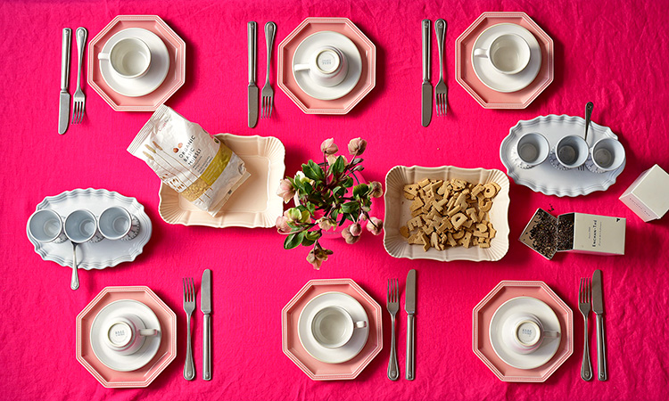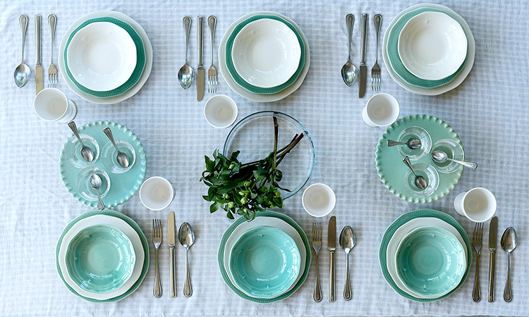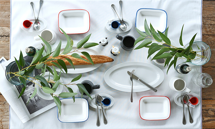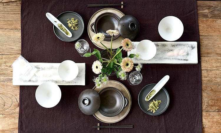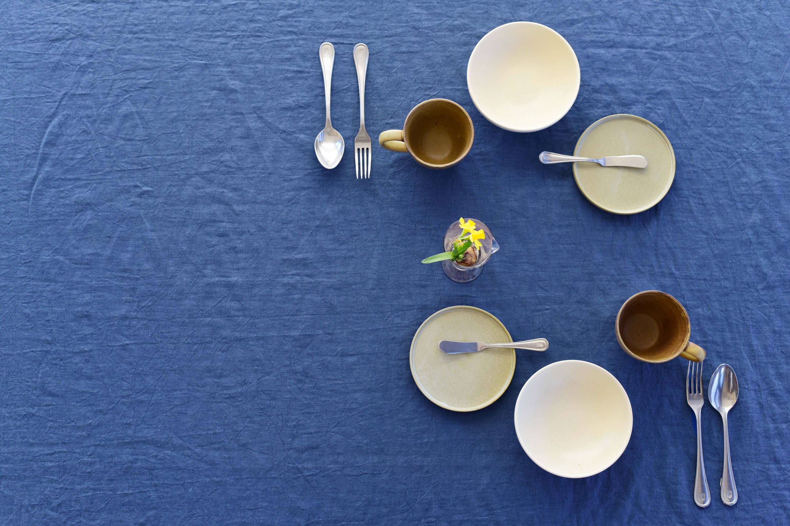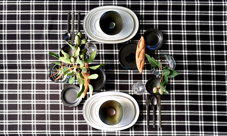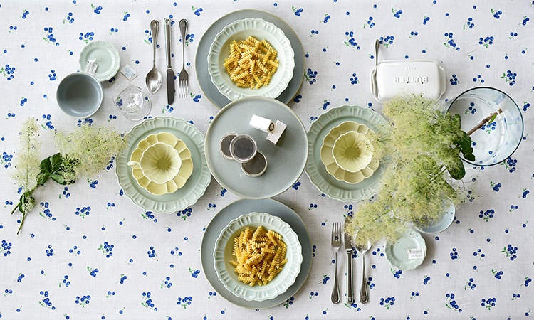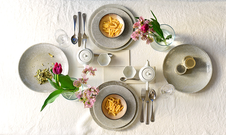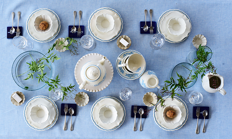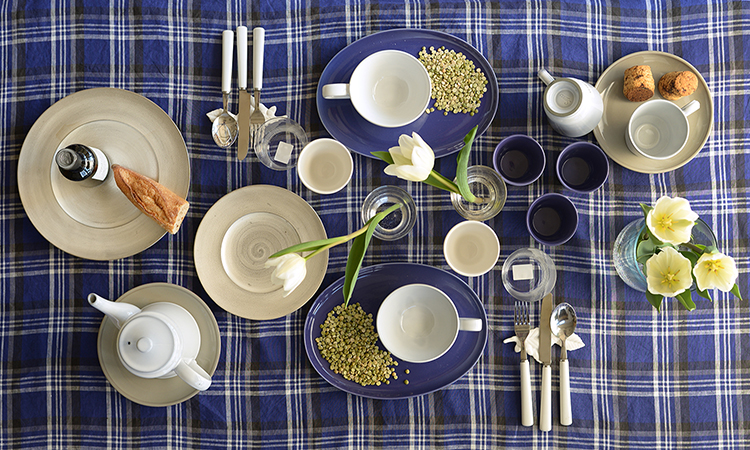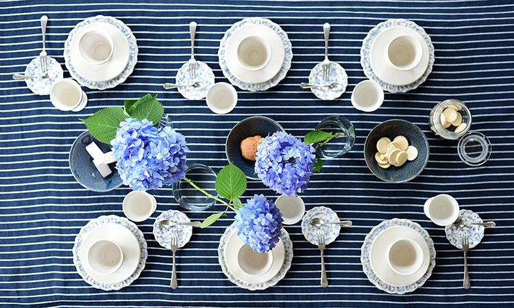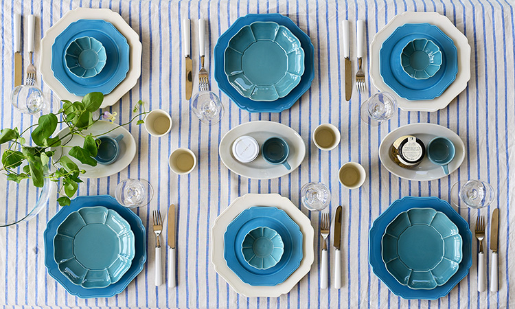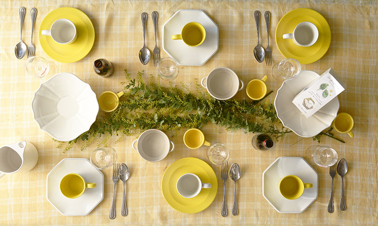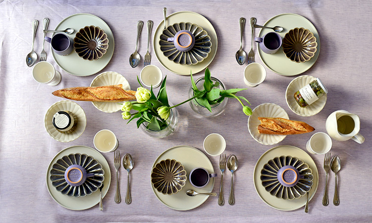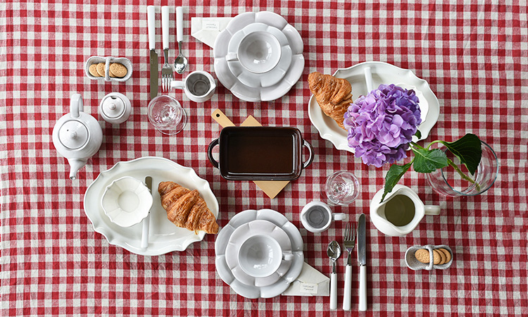 上質なリネンのテーブルクロスと食器を組み合わせることで、