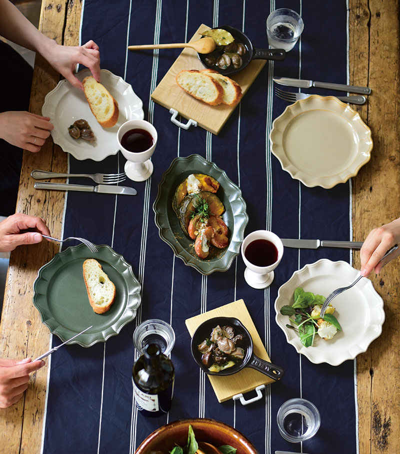 無骨で重厚感があり、暗めの色が食材を引き立て、テーブルコーディネートも引き締めてくれます。