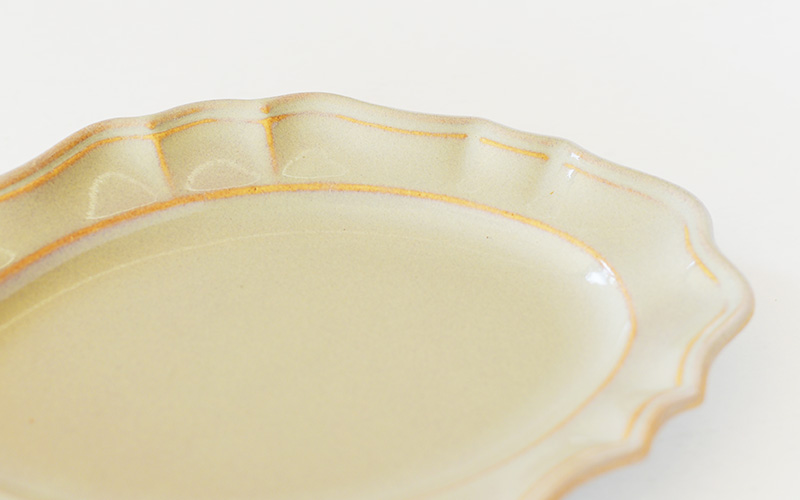 グレーは釉薬が薄くなった部分が茶色っぽくなり、特に縁や装飾の角を出した部分がより強調されます。